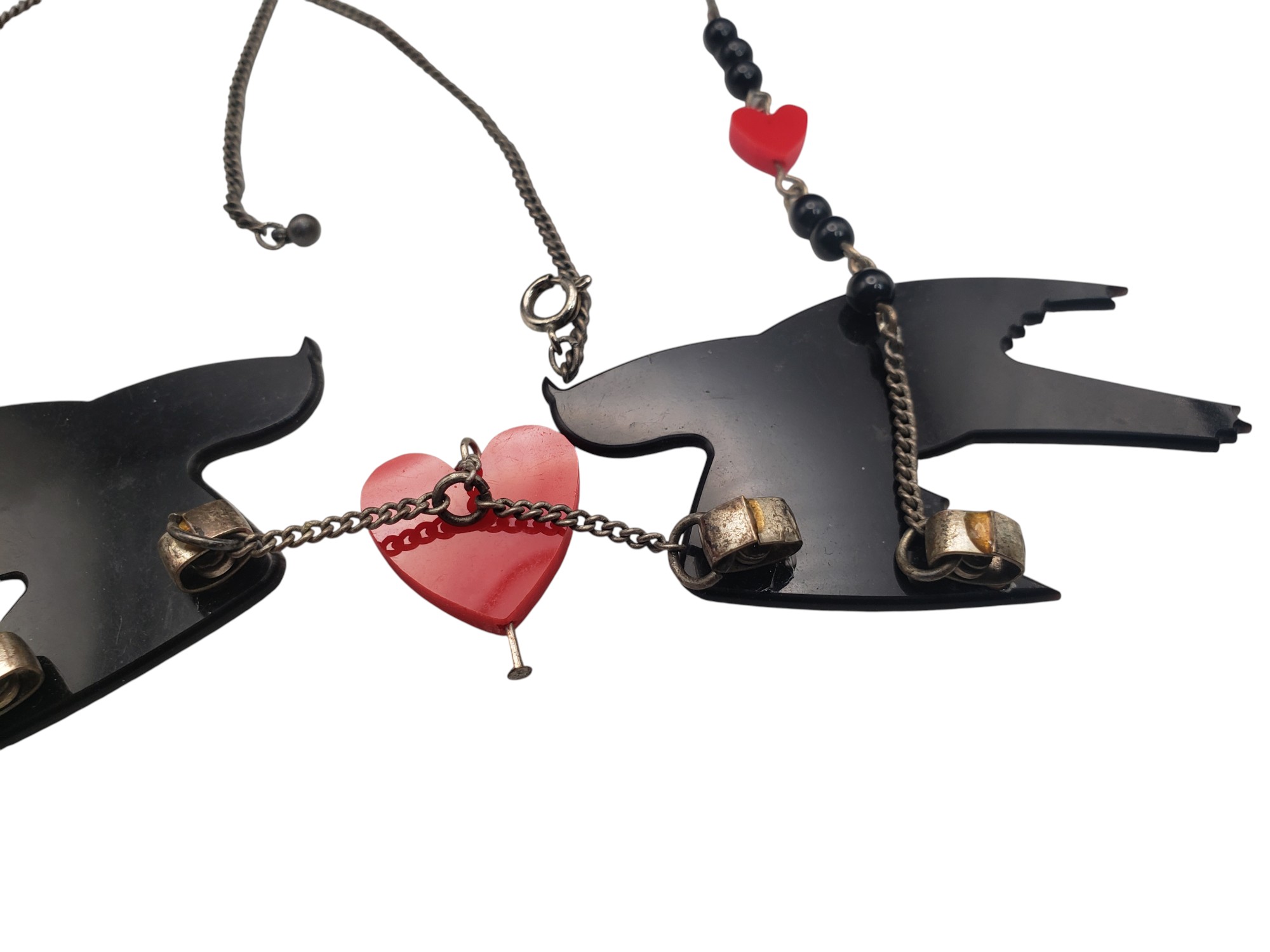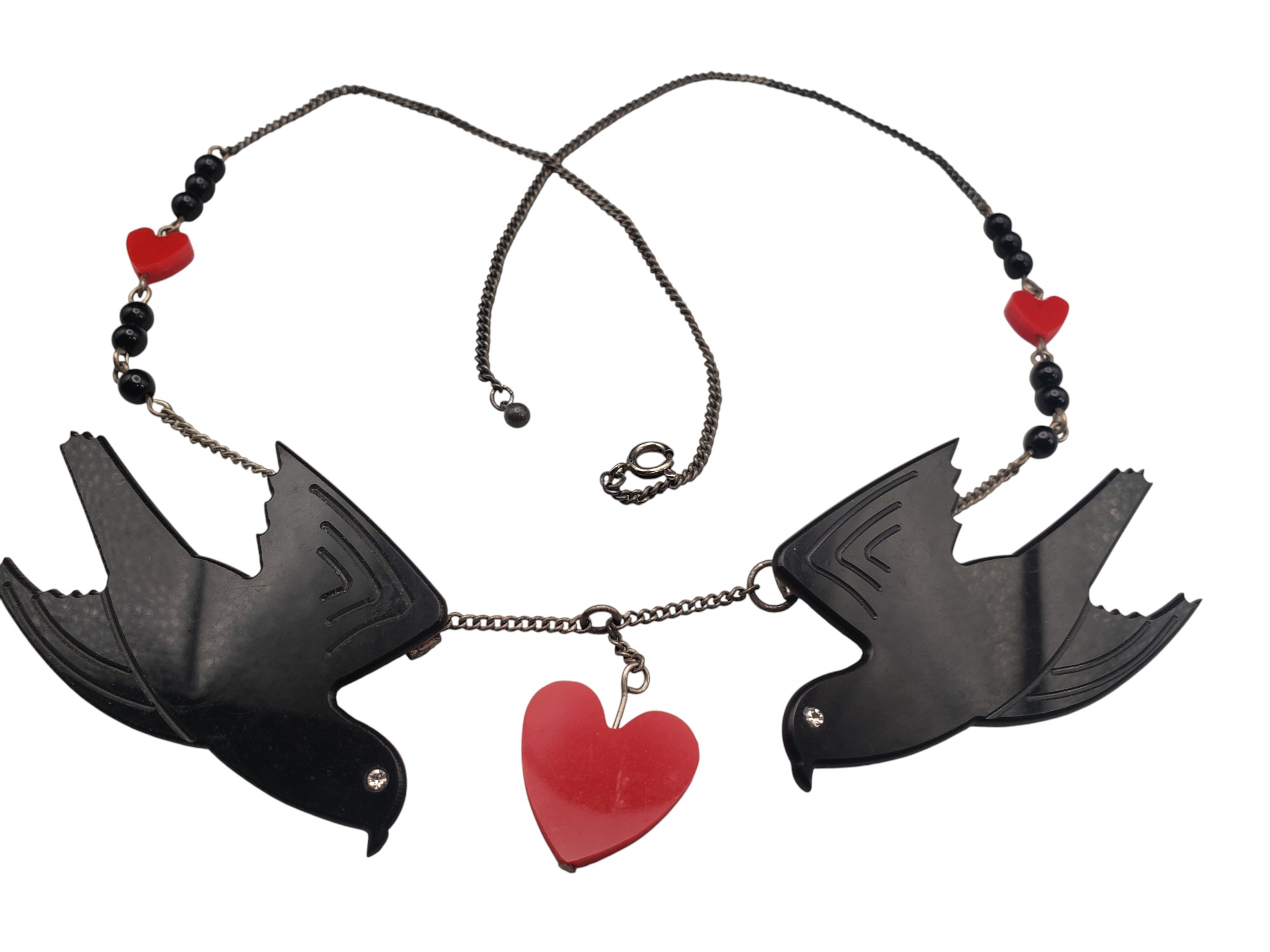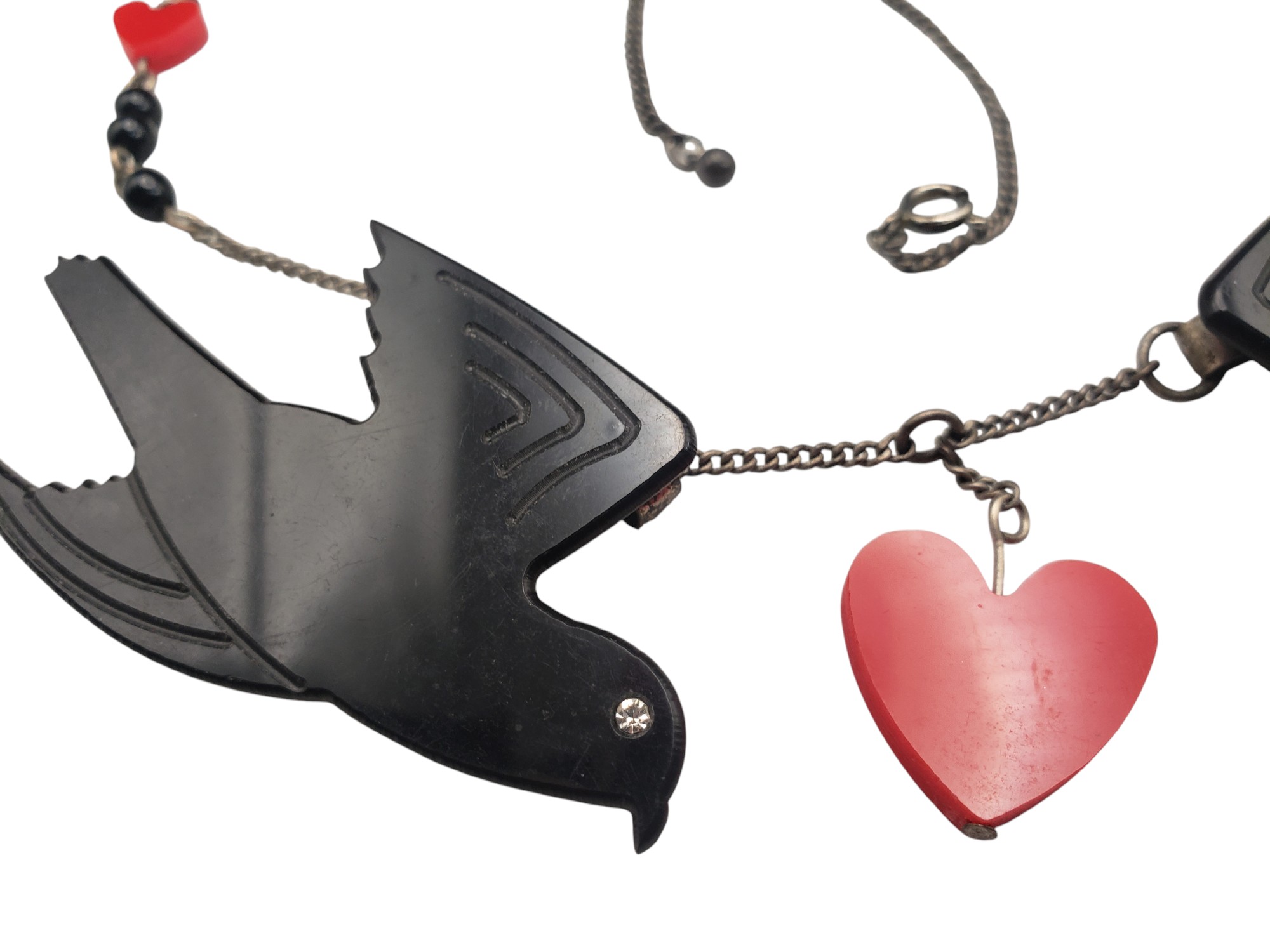 Marvelous and Very Unusual Birds and Hearts Necklace. Plastic blackbirds and red hearts are suspended on silver tone chain. The pieces are adorned by clear rhinestones. Necklace measures 18″ long. The birds are almost 3″ by 1.5″, the center heart is 3/4″ by 7/8″. Excellent condition.