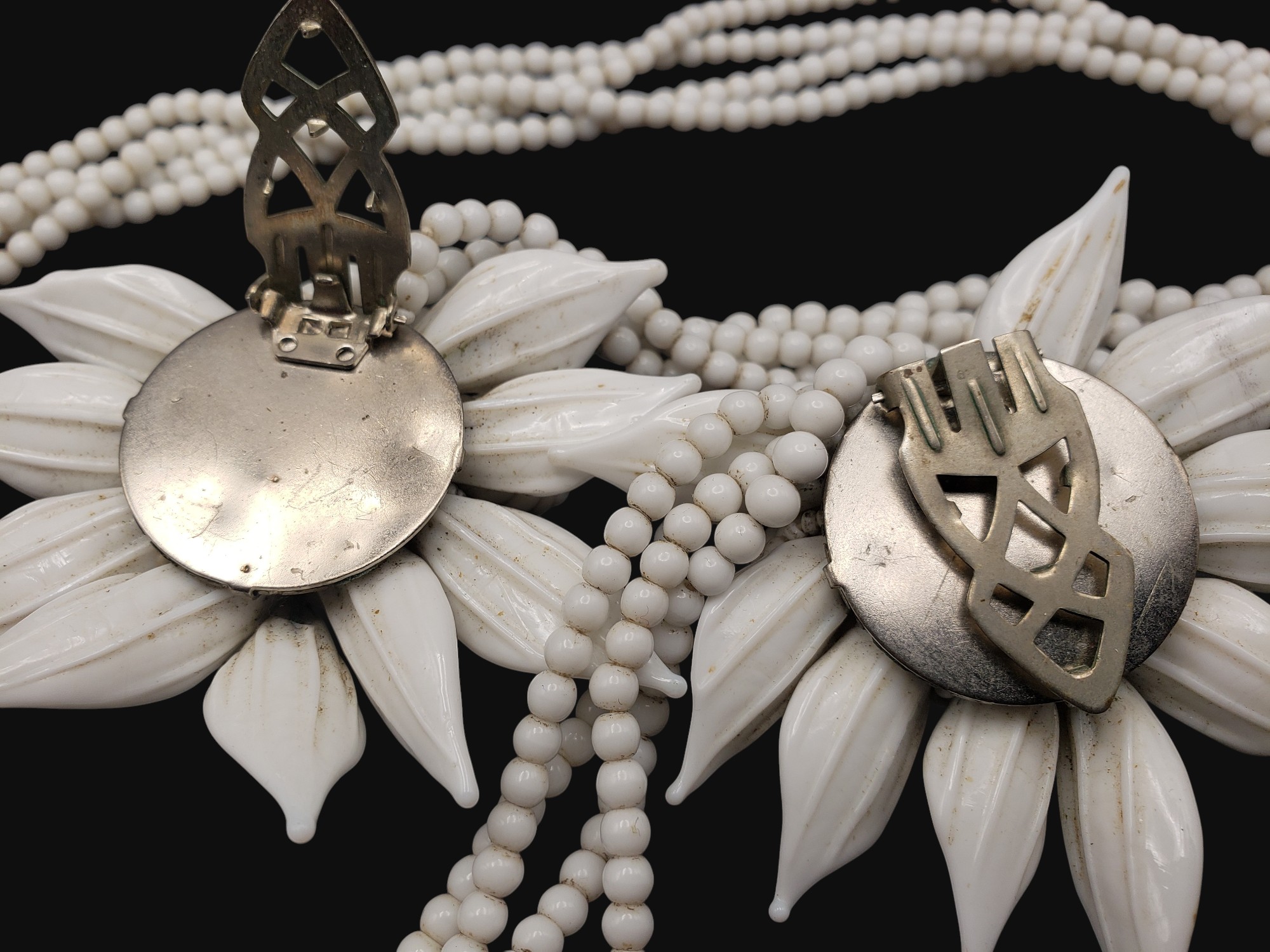 What a fabulous find! Early unsigned Miriam Haskell necklace. Similar one in pink was pictured in the book “Jewels of Miriam Haskell” by Deanna Farneti Cera. Two ornately beaded dress clips with large milk glass leaves and other beads are connected by four strands of milk glass. The dress clips have a perforated backing with silver tone covers. The clips measure about 3″ in diameter. The strands of white glass are 24″ long. It’s a rare find and is coveted by collectors everywhere. Excellent condition.