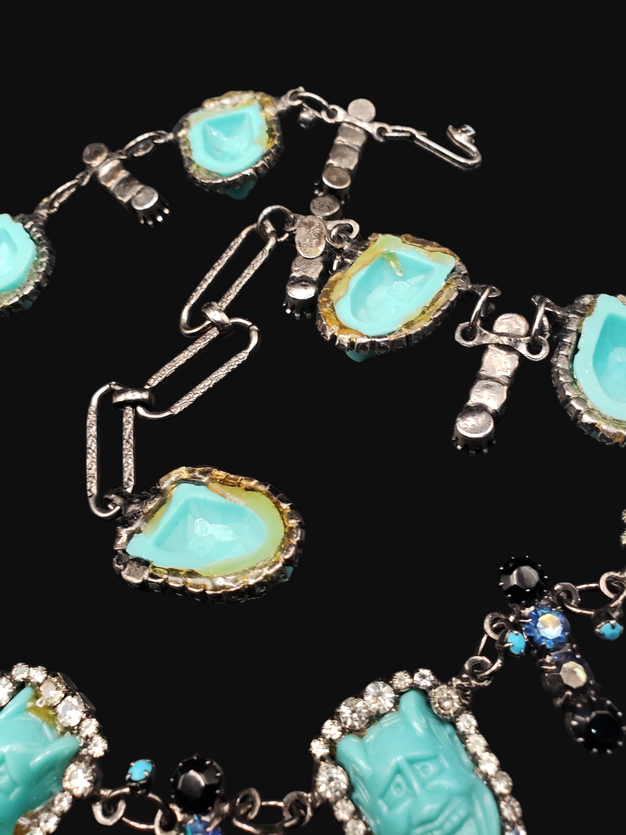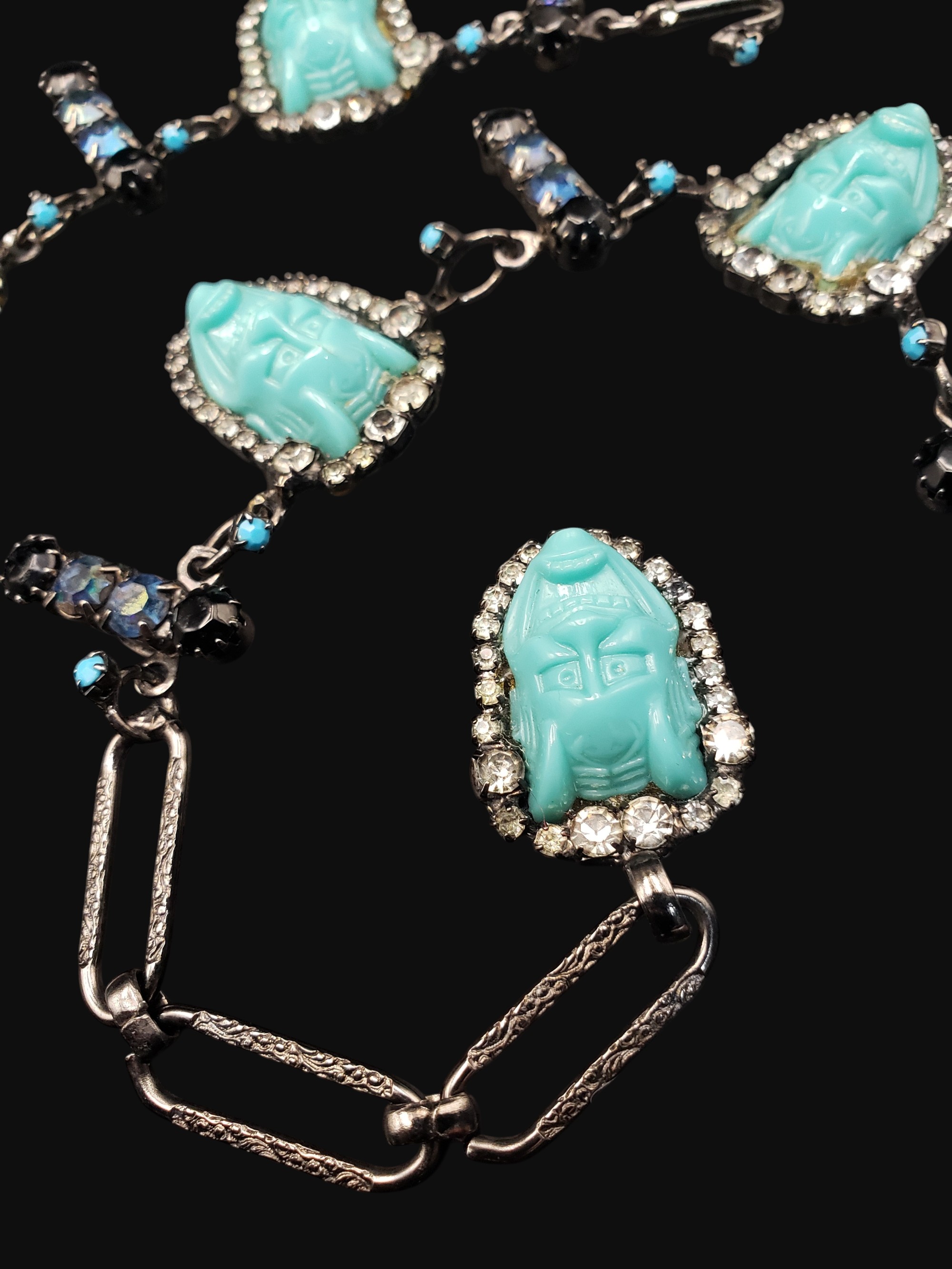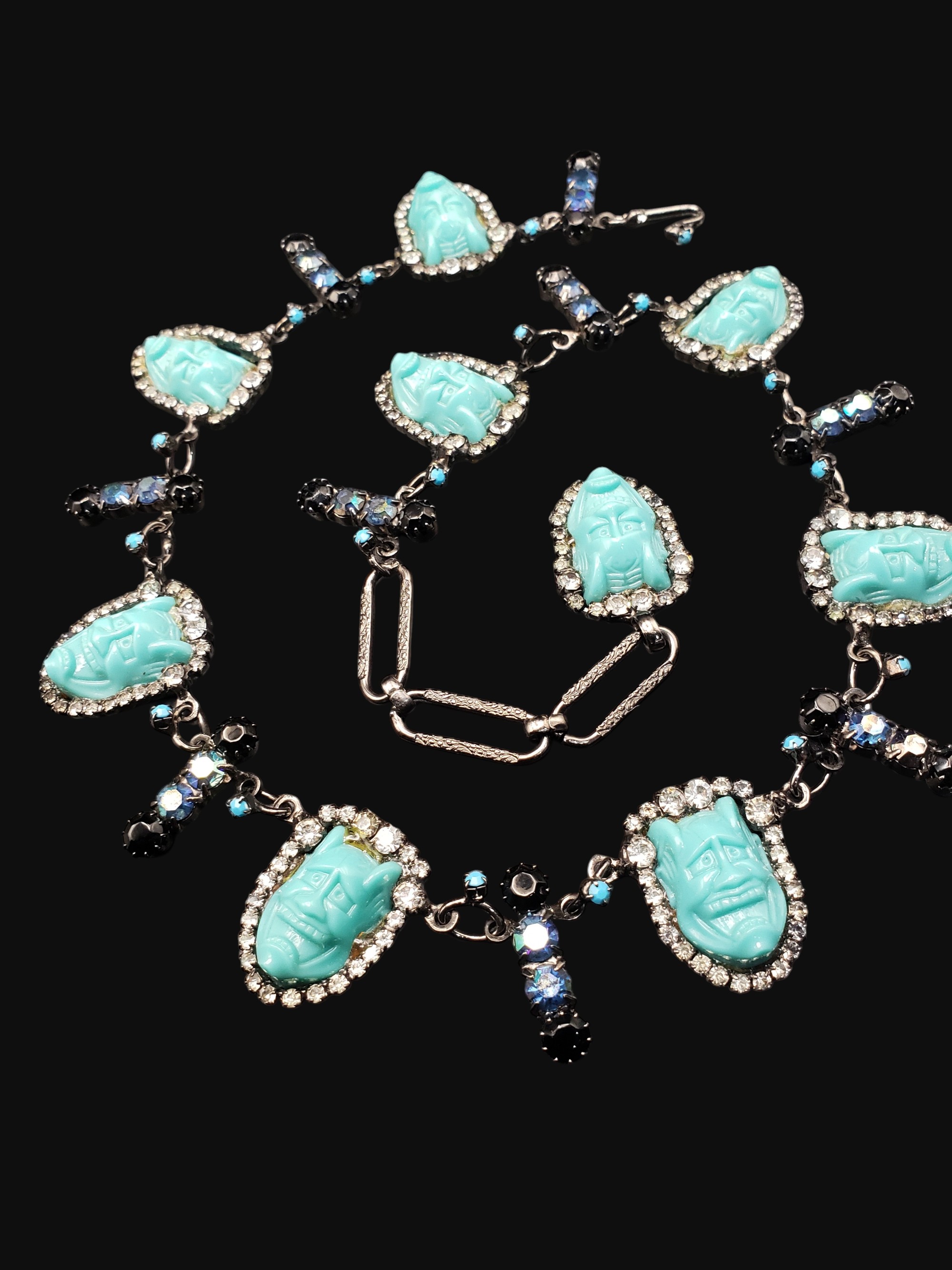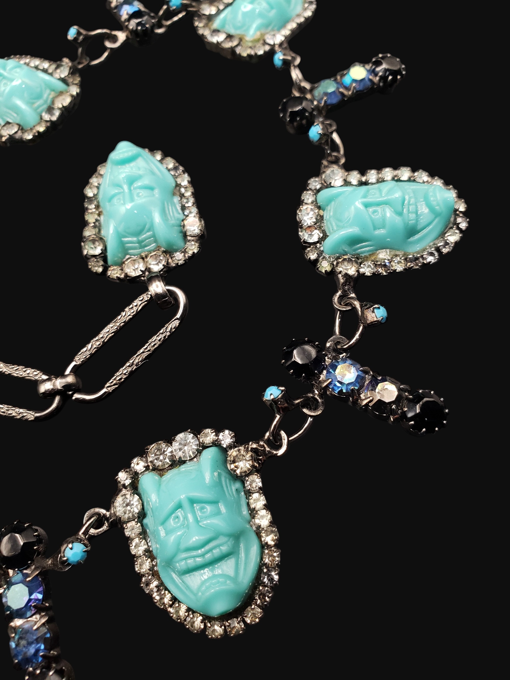 Unbelievable creation by David Mandell. So unique and creative! Turquoise colored devil faces surrounded by clear rhinestones alternate with rhinestone bars. Gun metal setting. Measures 23″ long by 1.25″ wide. Signed “The Show Must Go On” on the oval plaque on the back. There is glue residue on the back where faces are attached to the setting (it is original to the necklace), excellent overall condition.
