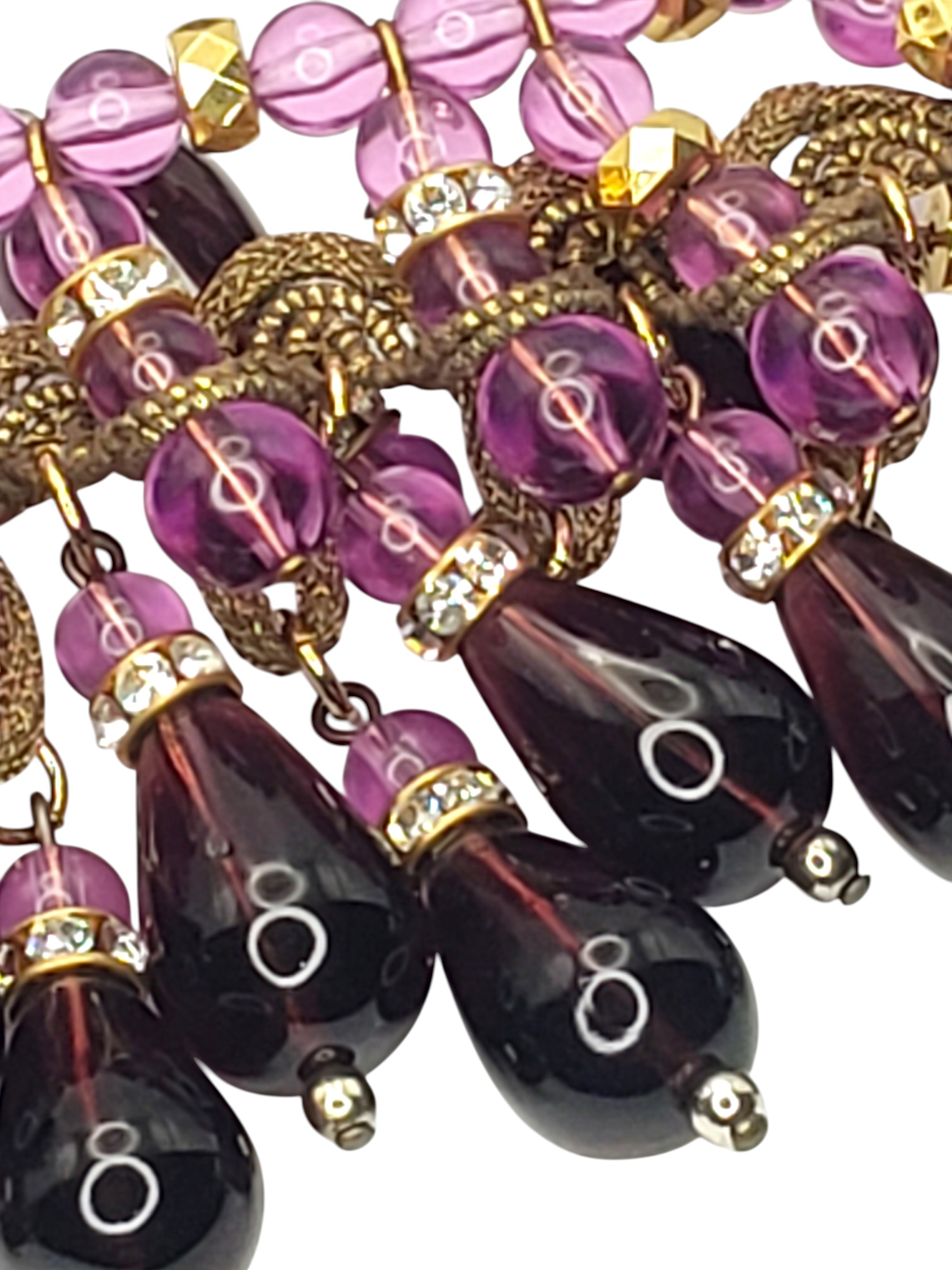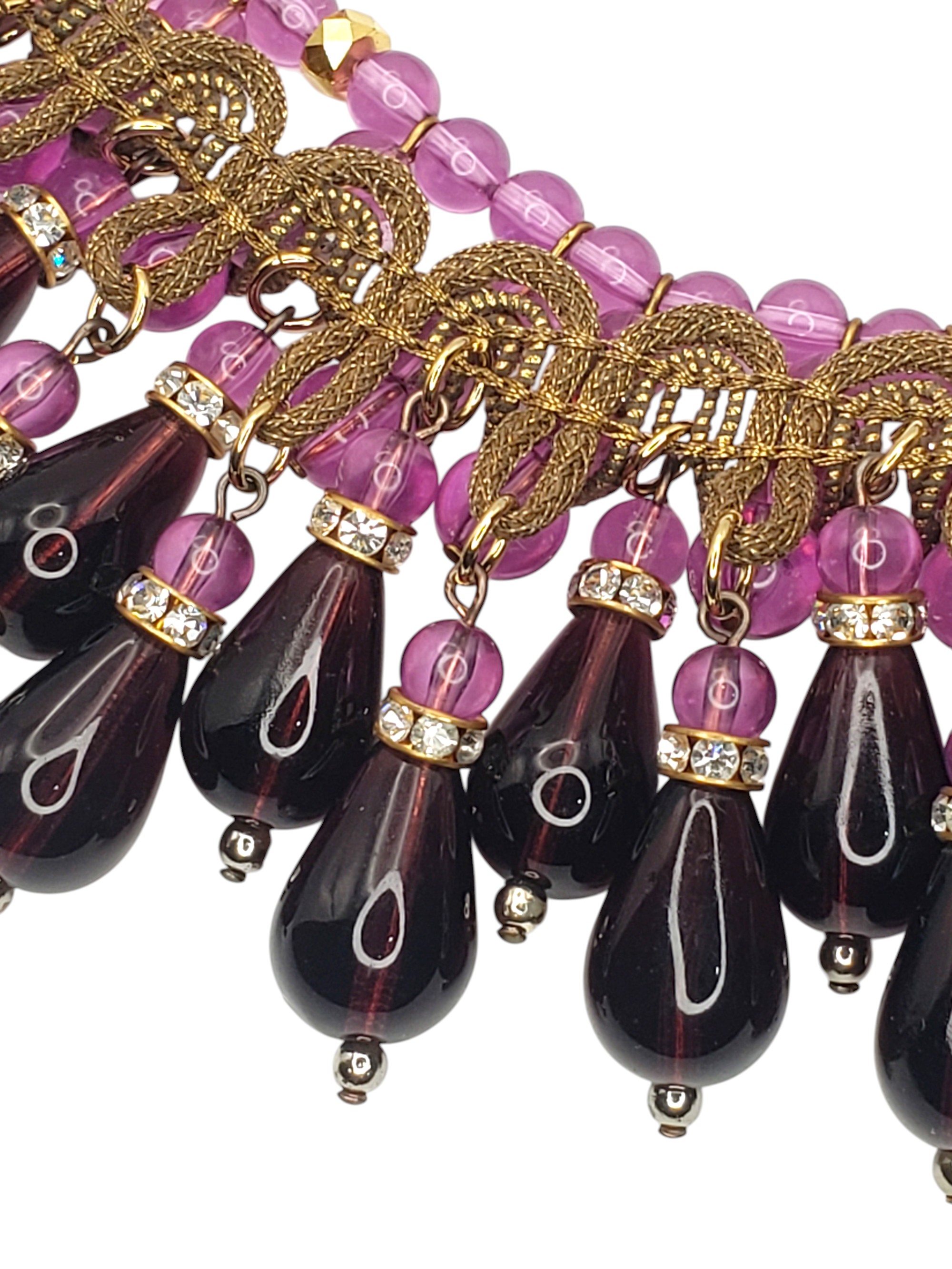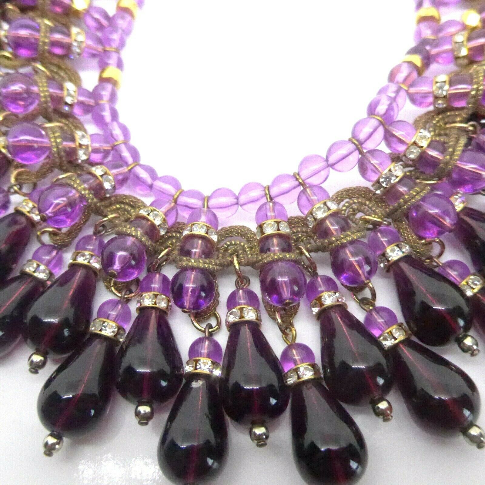 Absolutely SUPERB Heavy Purple Glass Collar Necklace. For some very special pieces I make up names and this one I called “Purple Passion”. Made of light and deep purple glass it is substantial and heavy. Has multiple layers of charms. Tear shaped ones are accented by clear crystal rhinestone rondelles. Neckline is adorned by ornate golden ribbon. Measures 16.25″ long and over 2.25″ wide in the center. Unsigned. Possibly French? Excellent condition.