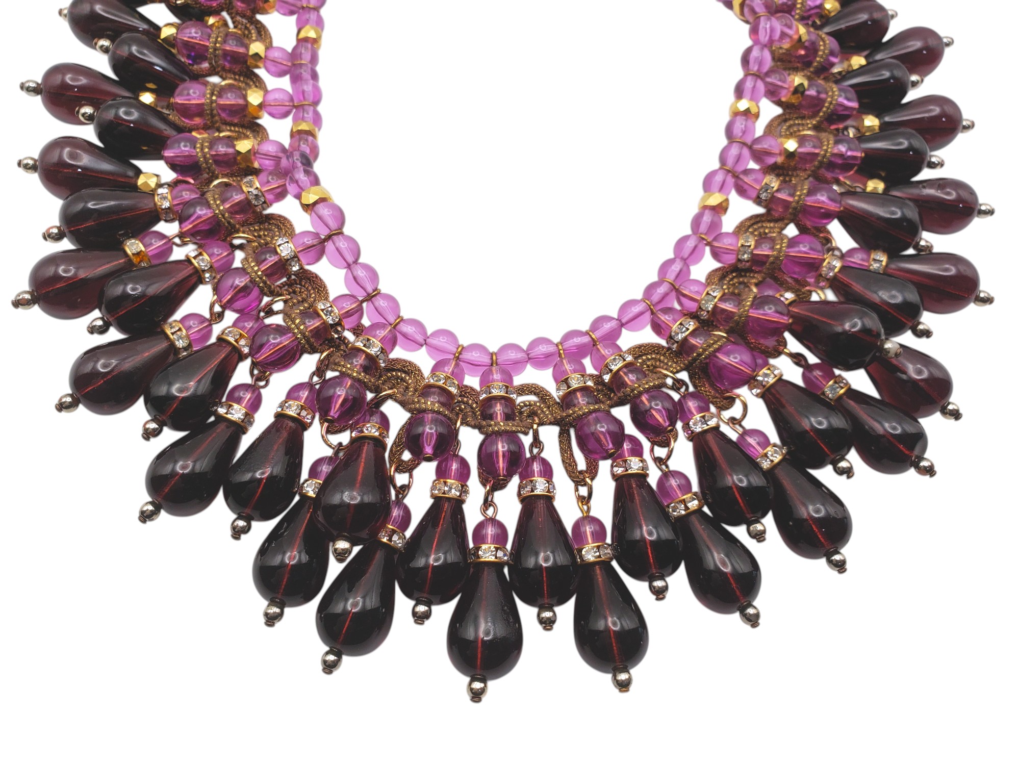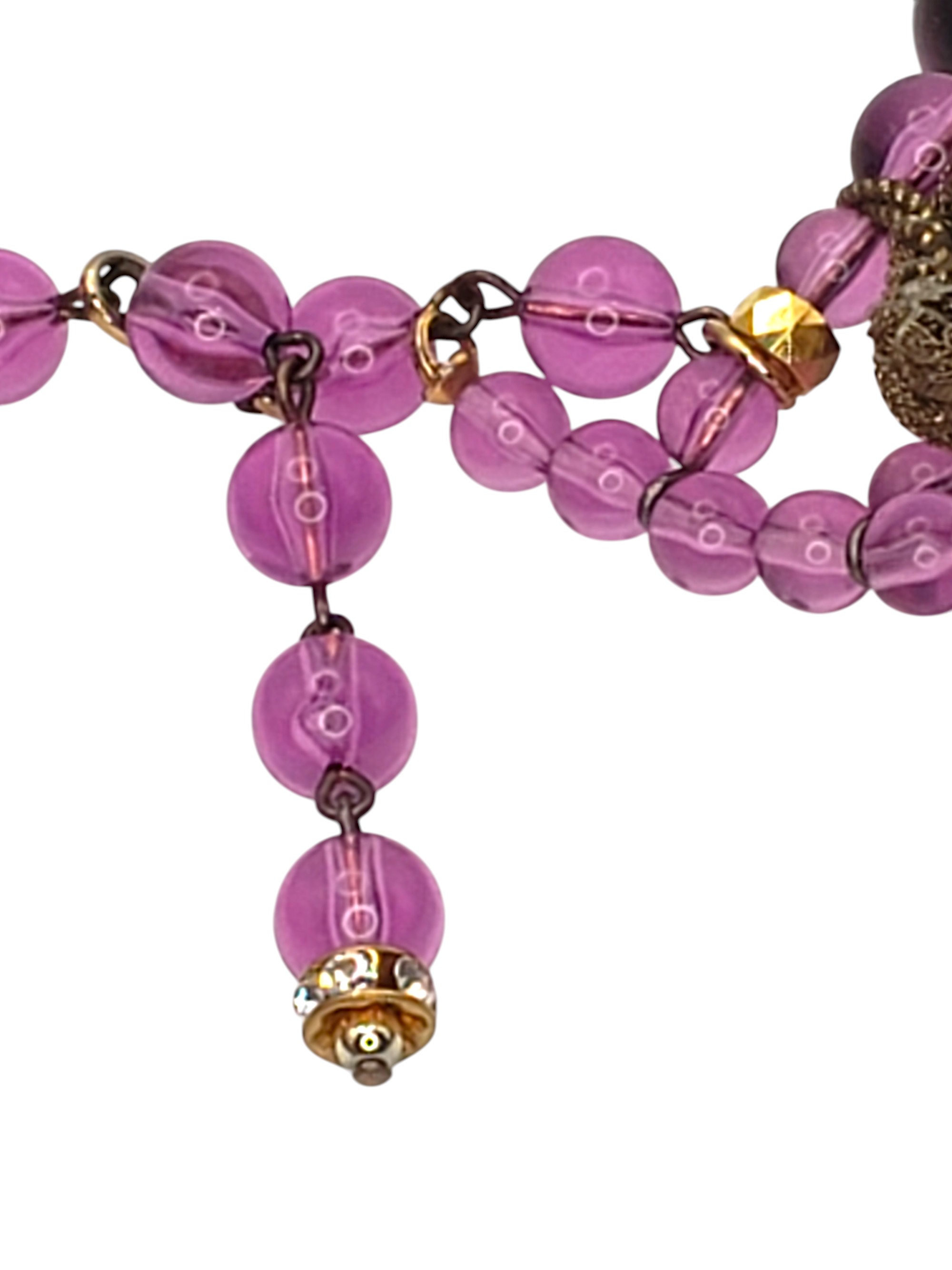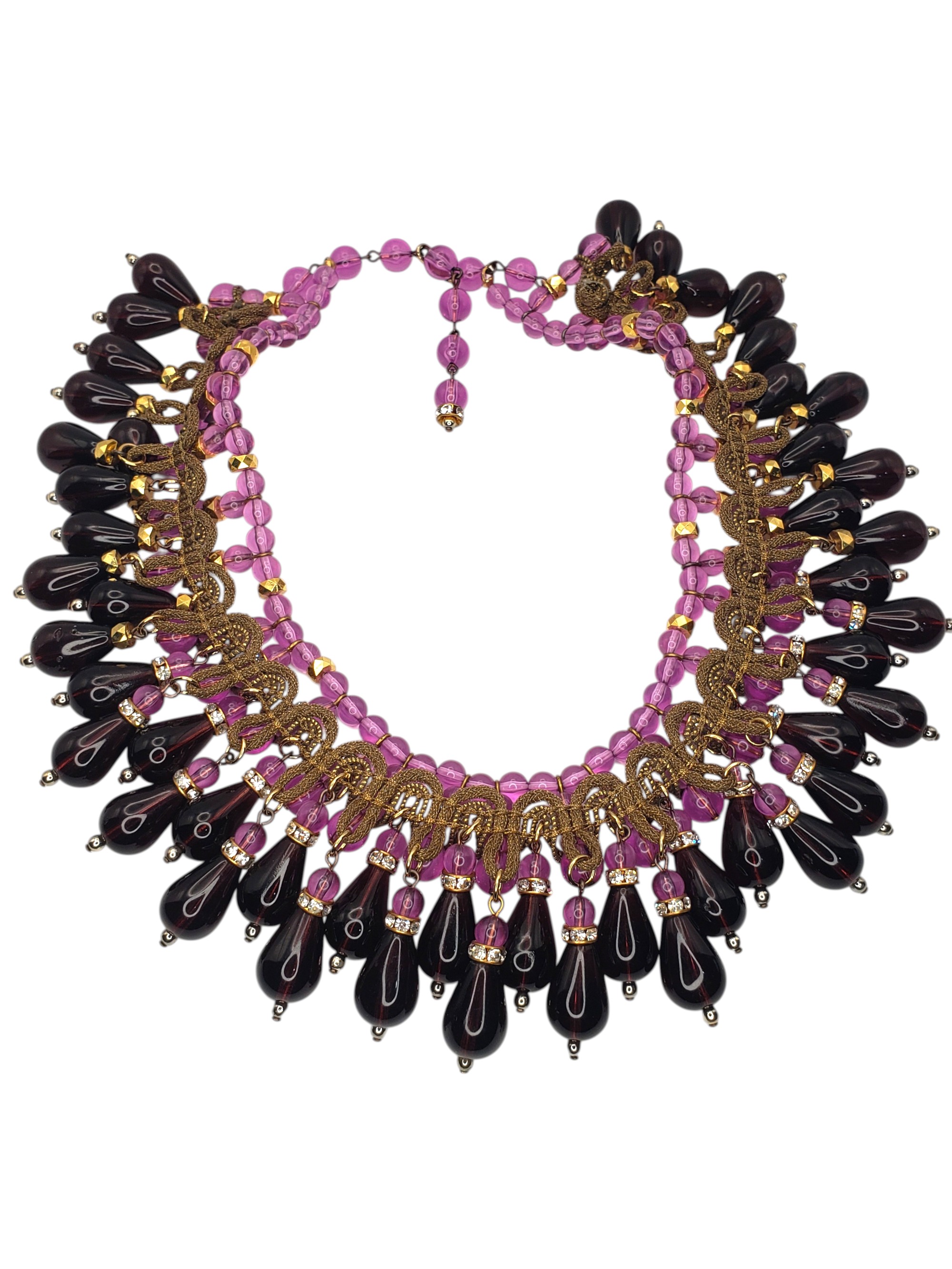 Absolutely SUPERB Heavy Purple Glass Collar Necklace. For some very special pieces I make up names and this one I called “Purple Passion”. Made of light and deep purple glass it is substantial and heavy. Has multiple layers of charms. Tear shaped ones are accented by clear crystal rhinestone rondelles. Neckline is adorned by ornate golden ribbon. Measures 16.25″ long and over 2.25″ wide in the center. Unsigned. Possibly French? Excellent condition.