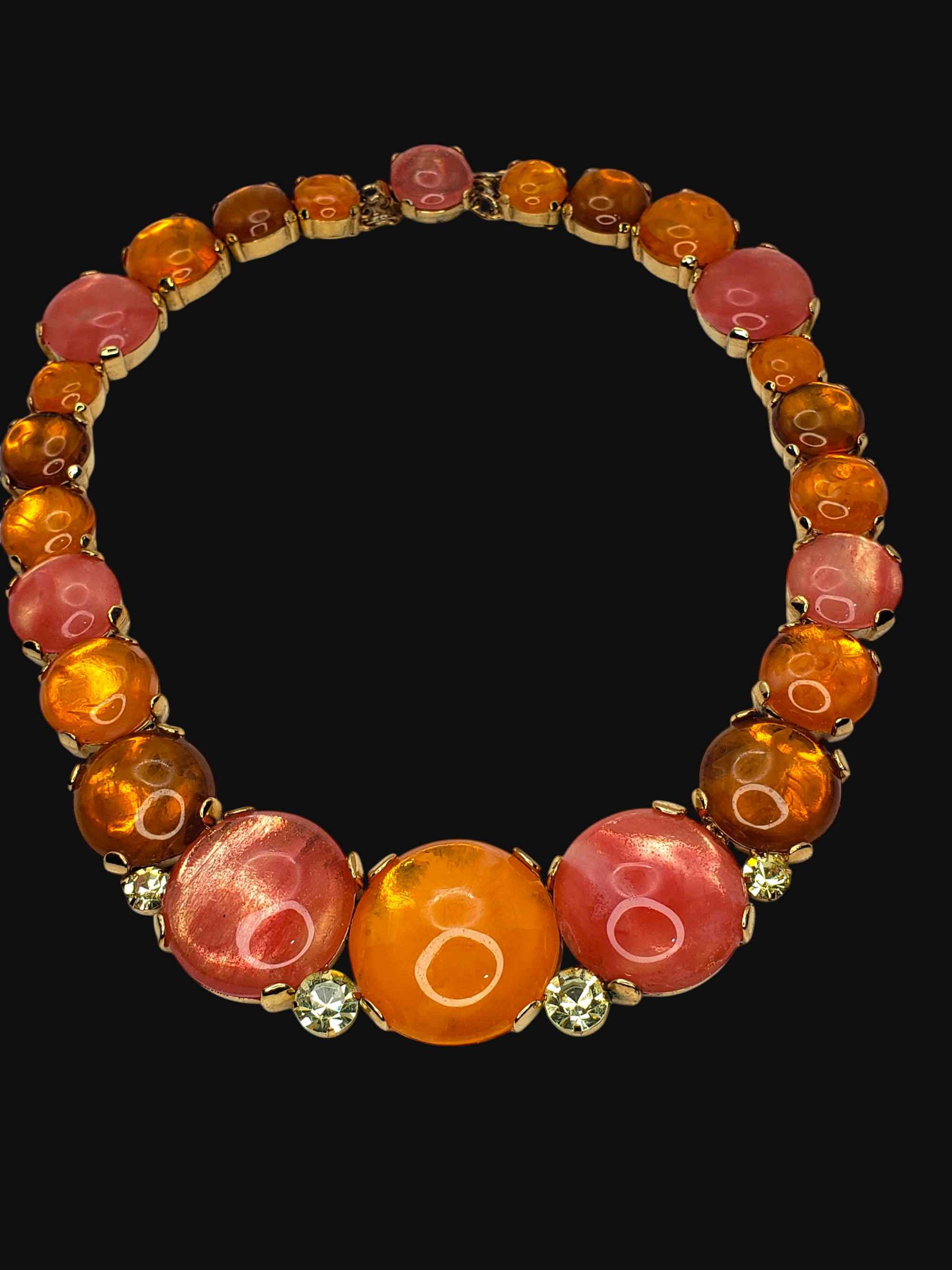 Substantial Bright Cabochons Collar Necklace. Heavy and very well made. Gold tone setting with huge cabochons in honey, amber and pink. The cabochons look like flawed stones. The center is adorned by citrine rhinestones. The cabochons differ in size from 0.5″ to 1 1/8″ in diameter. Necklace is not signed, but obviously a designer piece. It is 16″ long (hard to measure it). Excellent condition.