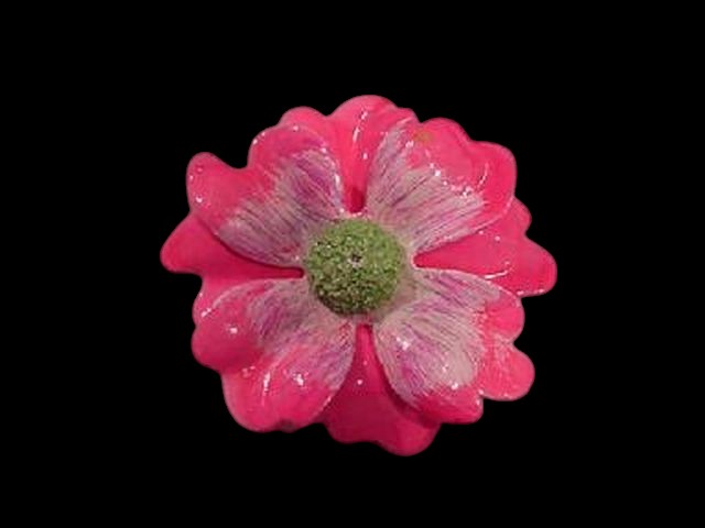 Stunning and HUGE Bright Pink Plastic Flower Brooch. Two layers of bright pink painted with purple, pink, white and green stricks petals and a large lime green button shaped center. Unusual and so 60s! Measures 3.75″ in diameter. Has gold tone pin back. One small chip on the bottom layer petal, otherwise excellent condition.