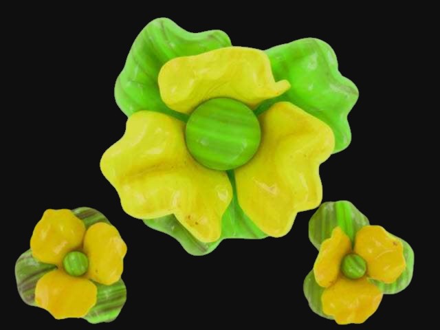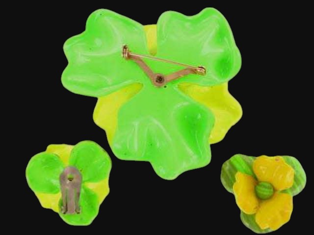 Fantastic plastic flower pin and clip on earrings set. Colors are stupendous – lemon yellow and lime green with some touch of milk chocolate. Gold tone findings. The pin is about 3″ in diameter and over 1″ tall. Matching clip on earrings are 1.5″ in diameter. Excellent condition with the exception of a couple small scratches on one of the yellow petals of the pin.