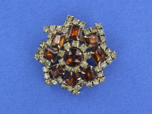 Beautiful Rhinestone pin in amber and citrine colors. Gold tone setting with sparkling rhinestones. Measures 2″ in diameter. Excellent condition.