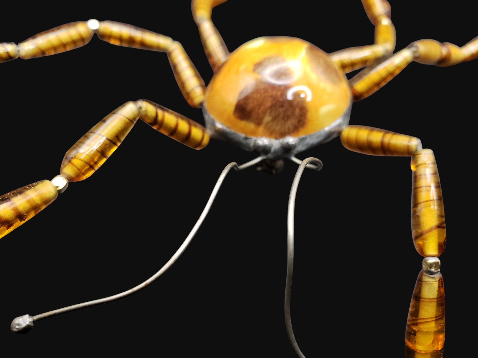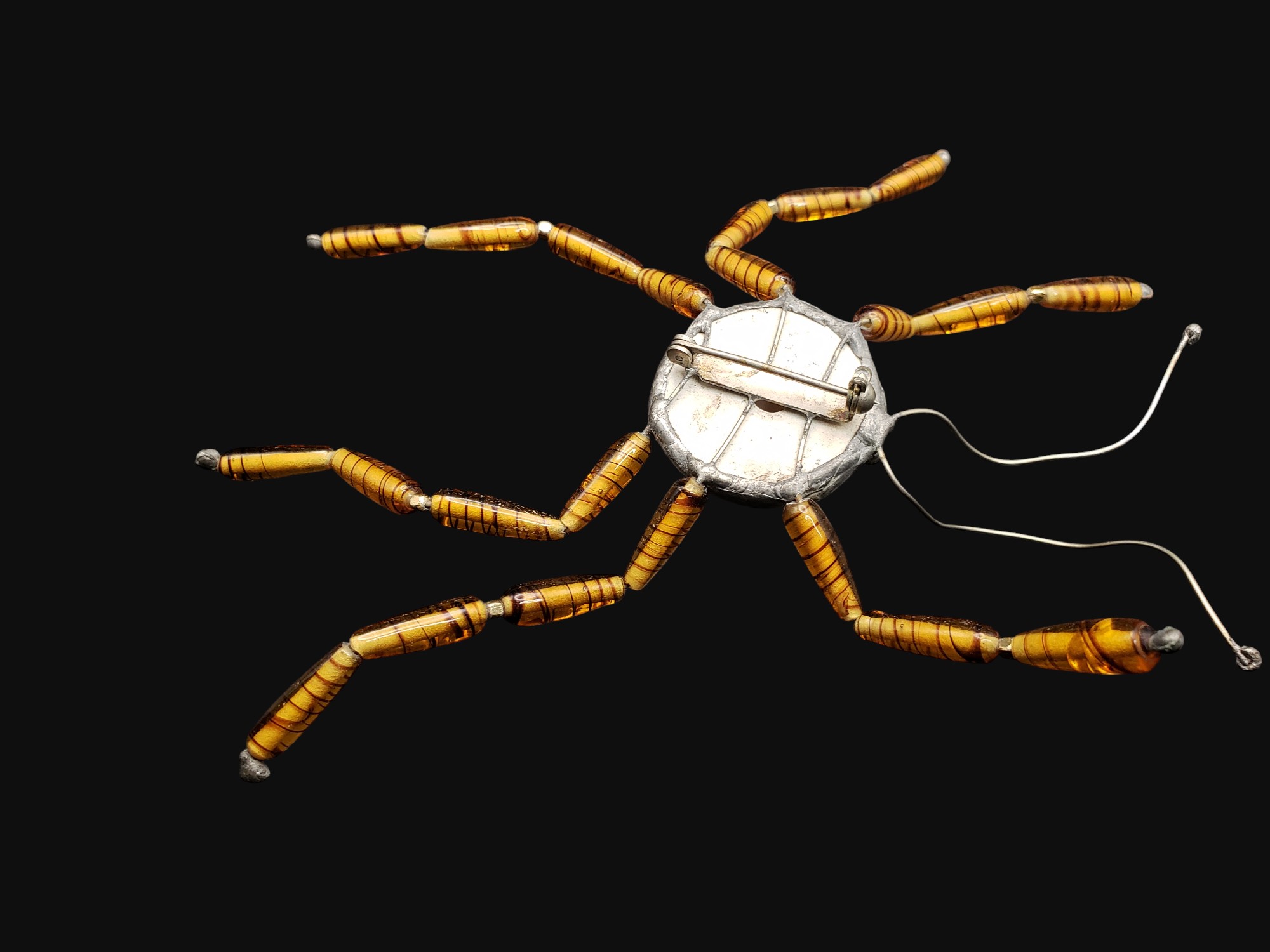 Fabulous and HUGE artist made spider brooch. Silver tone setting with large ceramic body in amber colors with legs made of amber art glass long oval beads. Measures about 6.5″ in diameter. Excellent condition.
