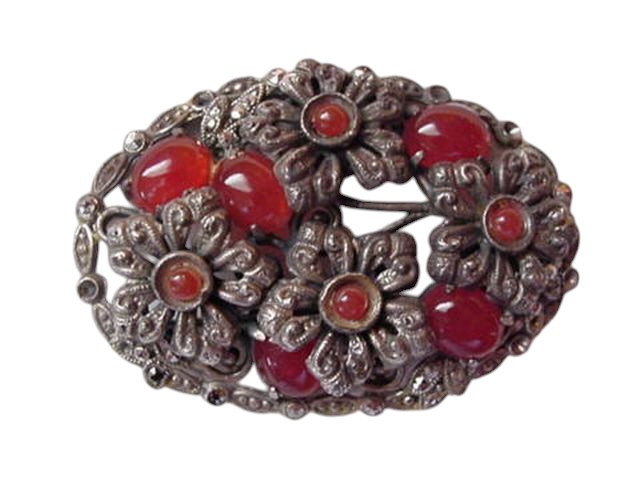 Beautiful floral pin with old fashion charm. Silver tone metal with marcasites and large faux carnelian cabochons. Measures 2 1/4″ by 1 5/8″. Excellent condition.