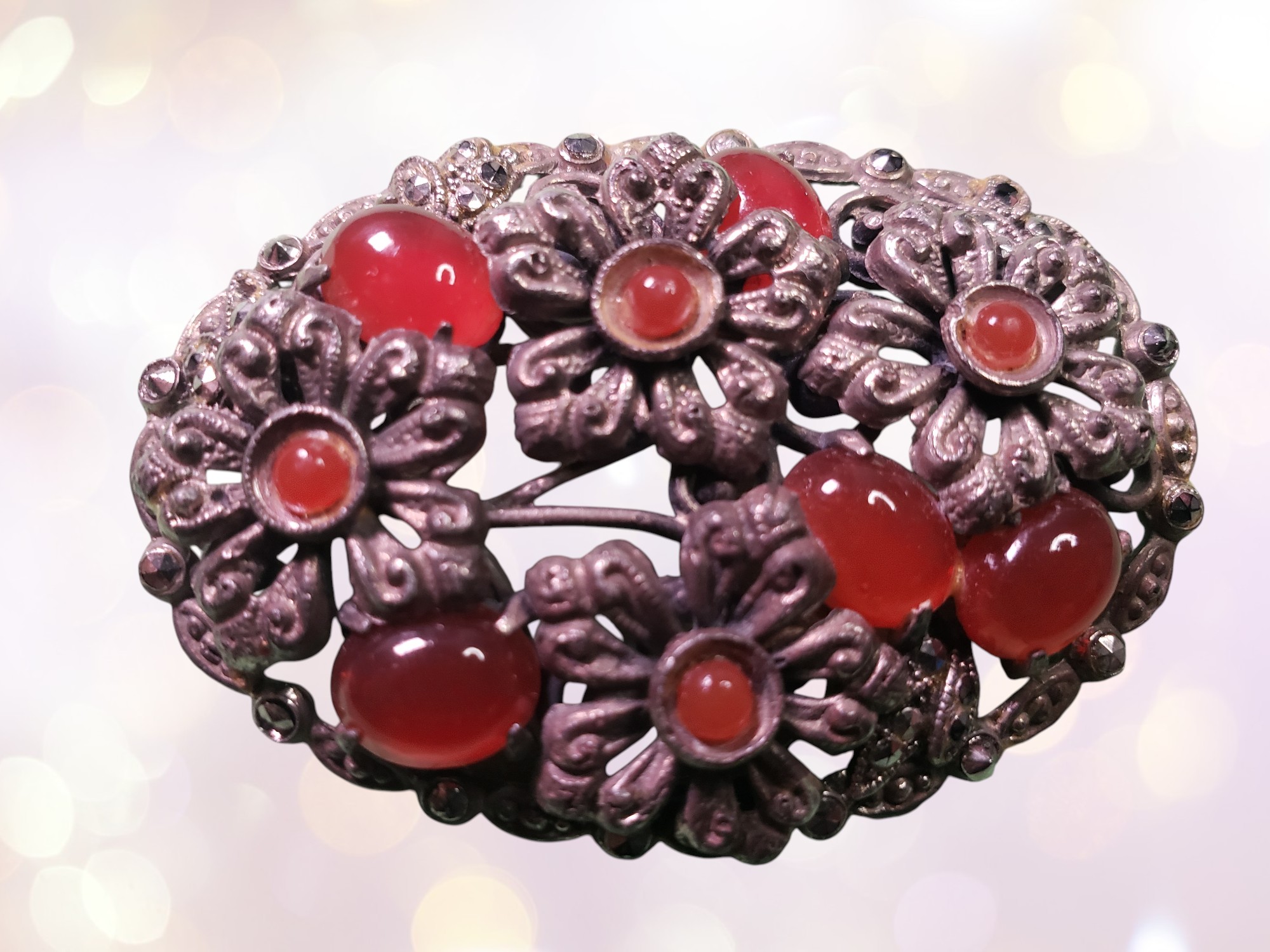 #forgottenromance #jewelry #vintage #vintagecostumejewelry #fashion #arttowear #couture #runway #marcasite #carnelian #brooch #pin