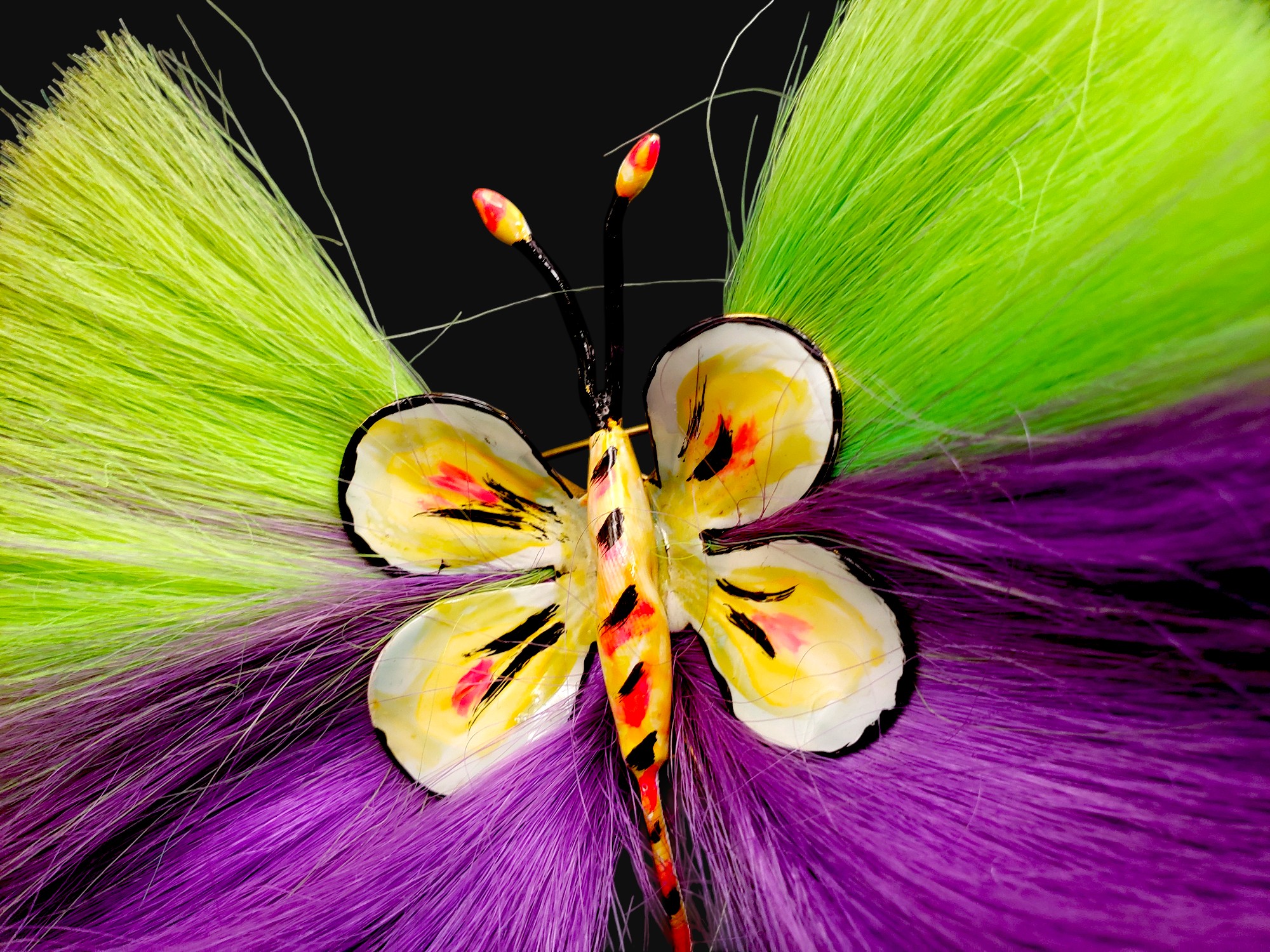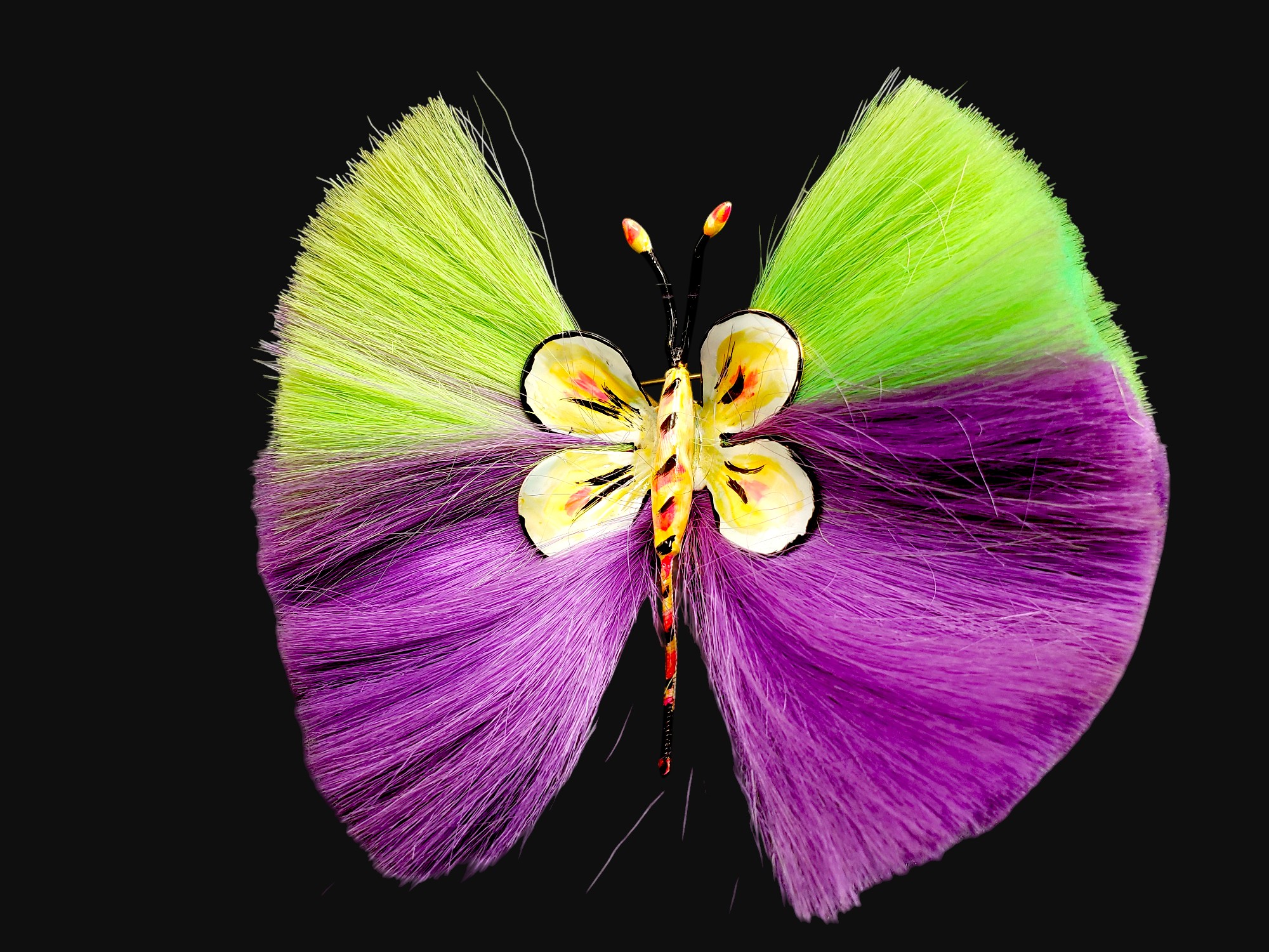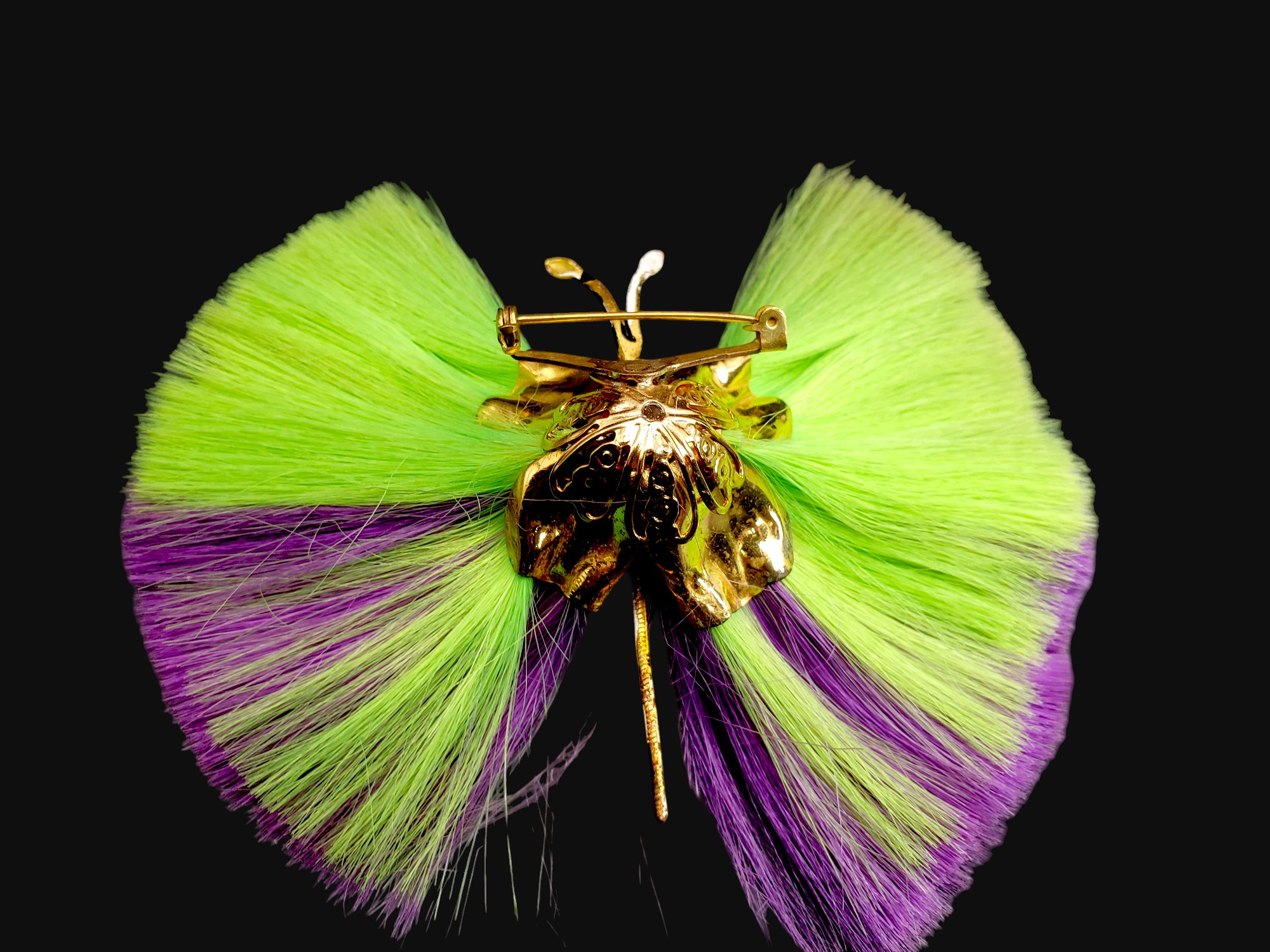 Very RARE and unusual powder puff pin by Hattie Carnegie. This type of pins is highly collectable and can be seen in in the “Jewels of Fantasy” by Deanna Farneti Cera. Bright lime green and purple bristles with colorful enamel body. Pin measures over 4″ by 3.75″. Unsigned. Excellent condition.