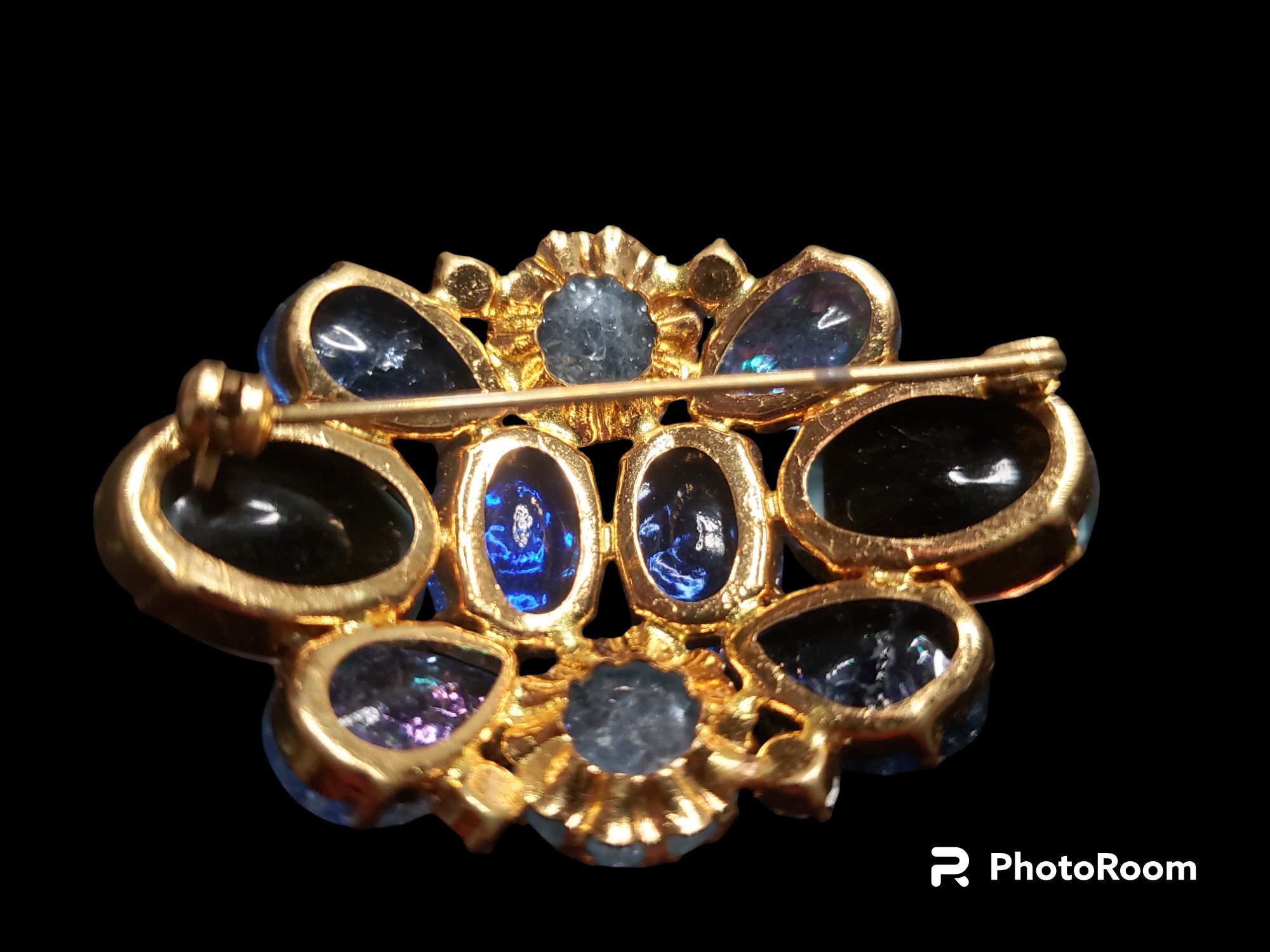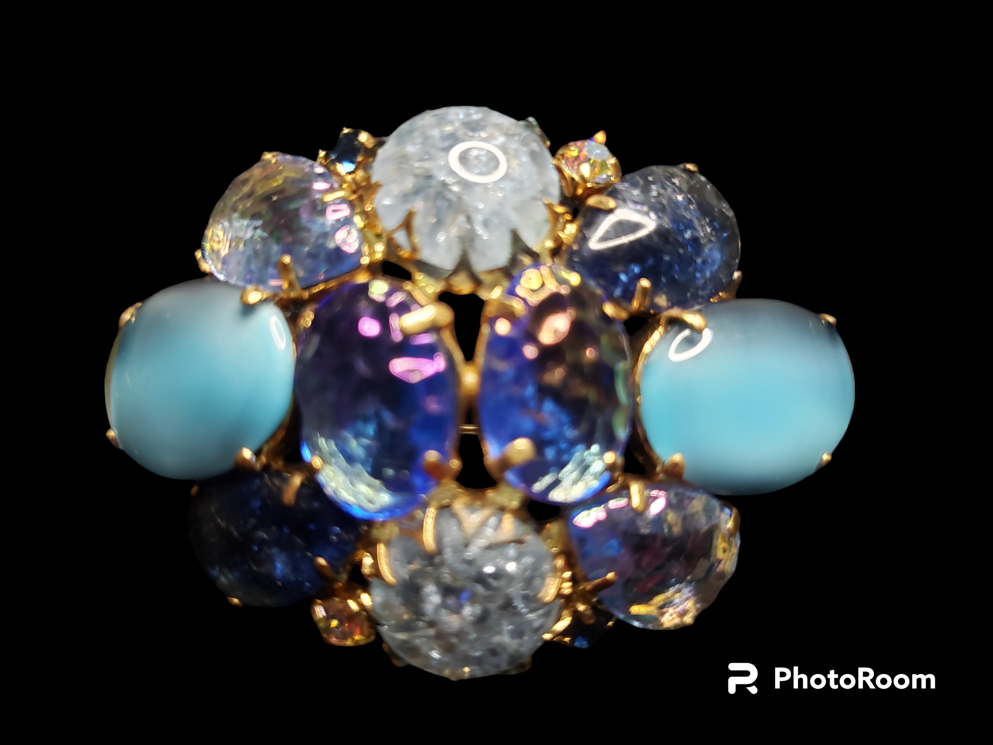 Beautiful cluster brooch with textured stones. Gold tone setting with most fabulous stones in blue colors. Most likely Austrian. Measures 2 1/8″ by 1.5″. Unsigned. Excellent condition.