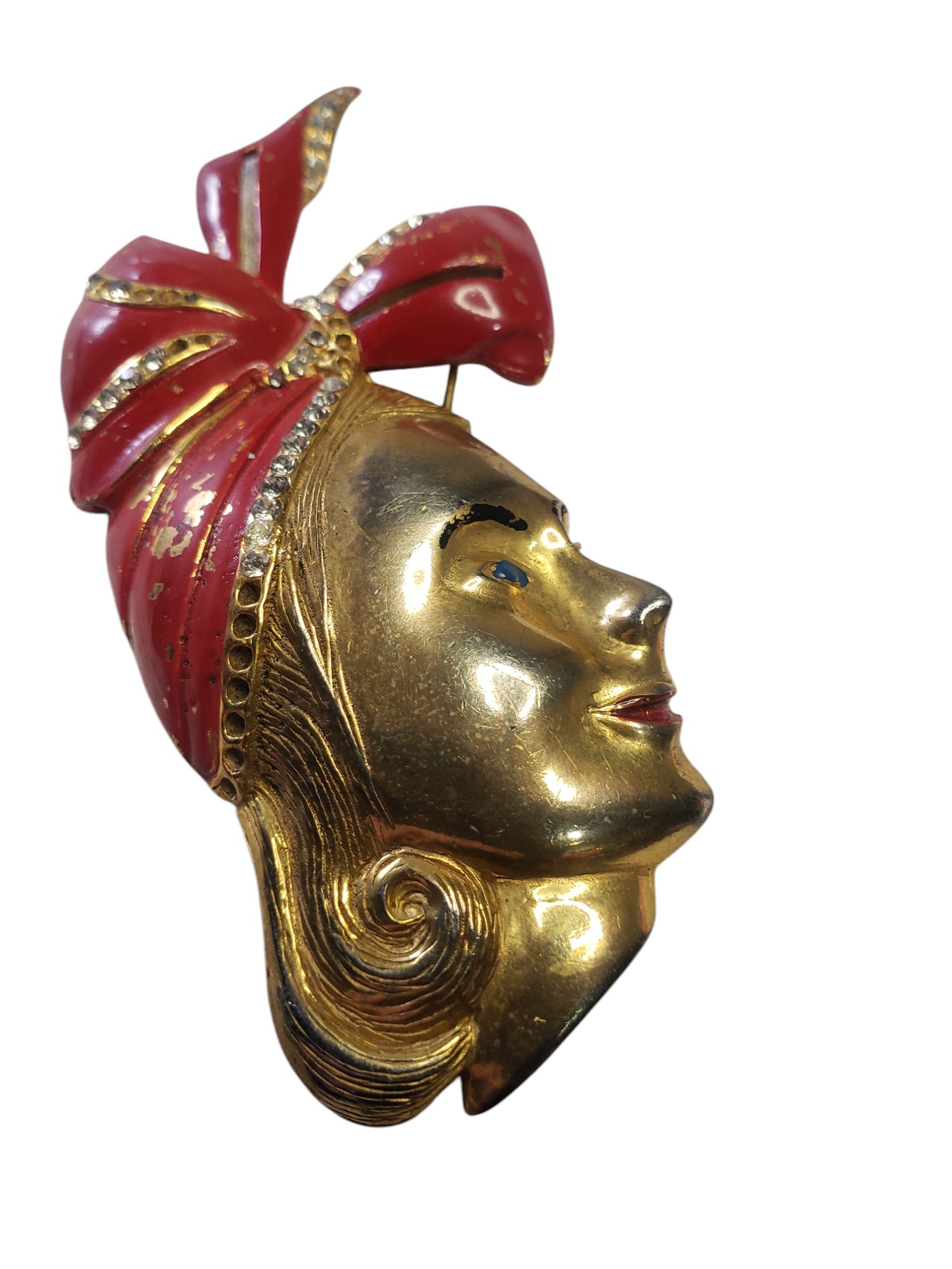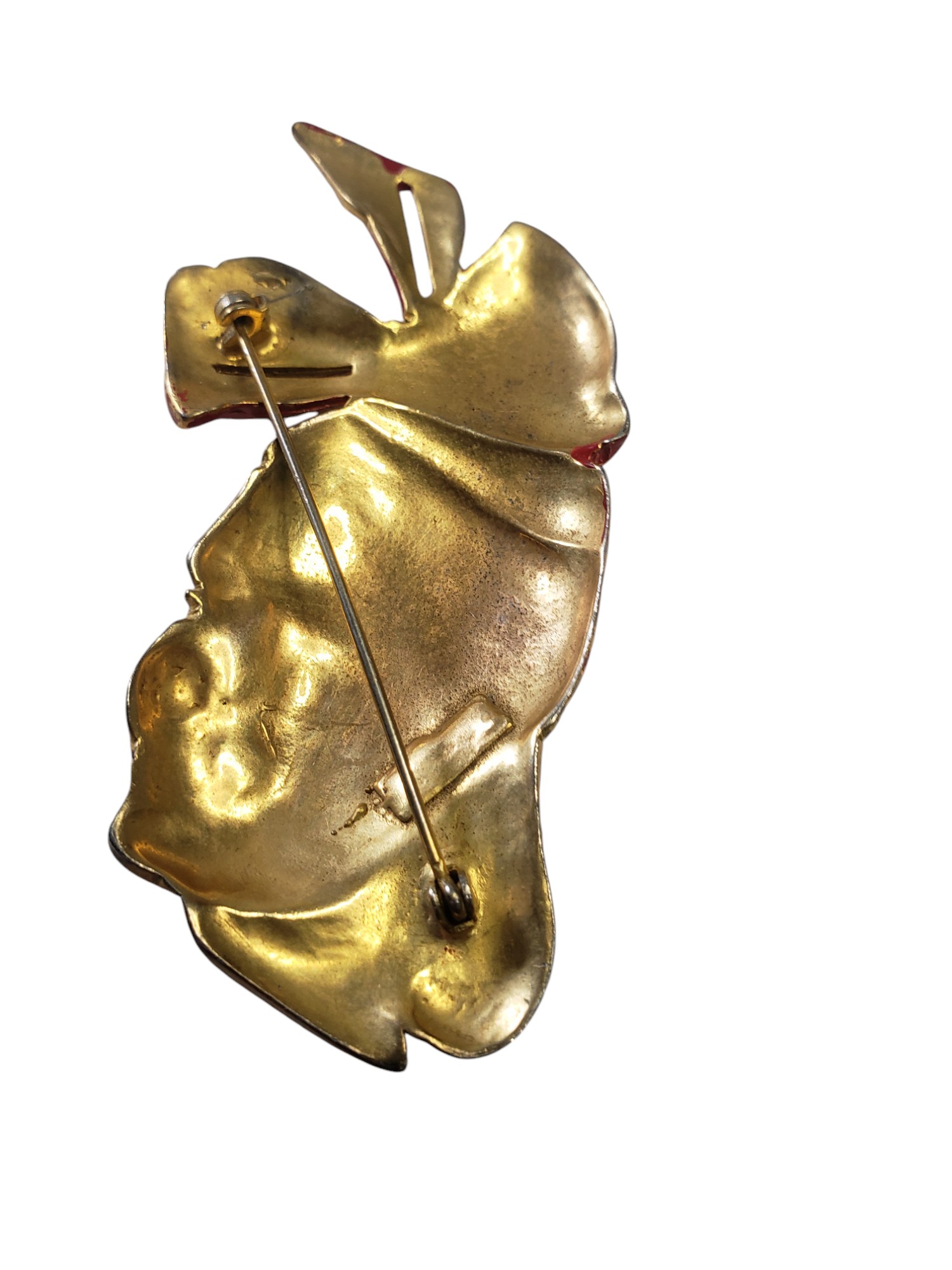 Fantastic large old brooch. Possible Corocraft, but unsigned. Rhodium plated gold tone setting with red enamel and adorned by clear rhinestones. Measures 3.5″ by 1.5″. Just a very minor enamel loss, but overall excellent condition.