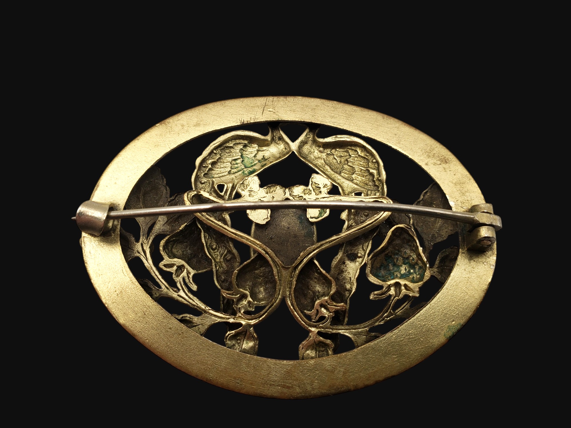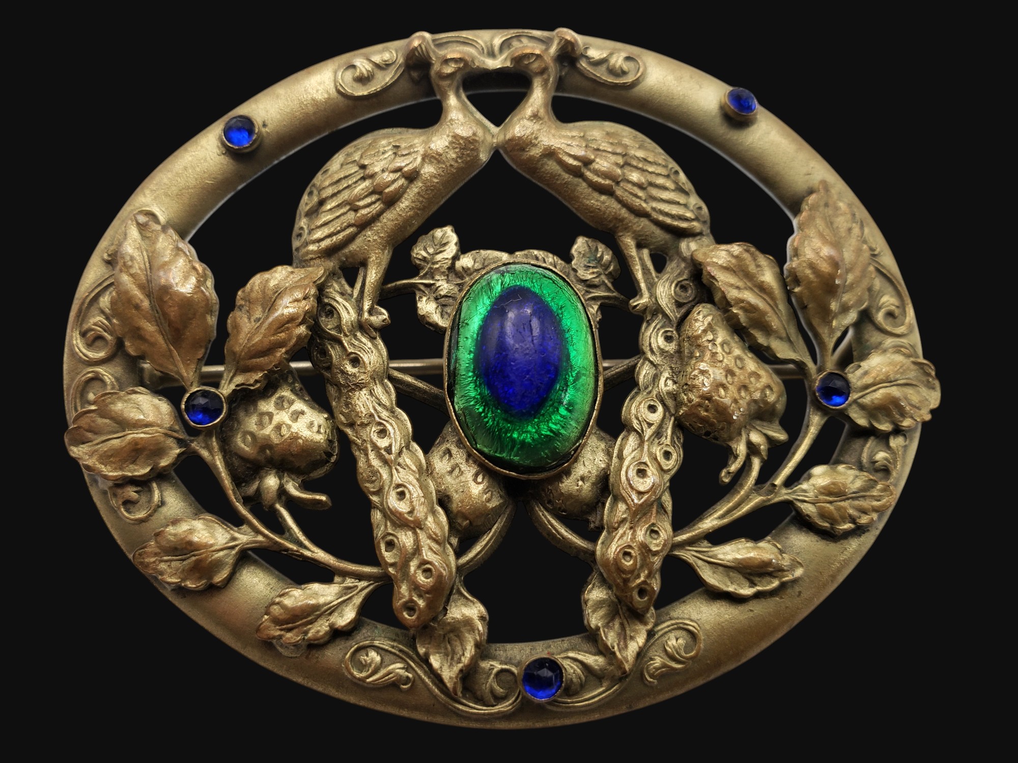 MOST Gorgeous Sash Pin with Peacocks and Peacock Eye Glass Cabochon. Wonderful ornate gilded brass setting is very ornate depicting peacocks and leaves adorned by small piercing blue cabochons. The center has large peacock eye glass cabochon. Measures 2.75″ by 2 1/8″. Excellent condition.
