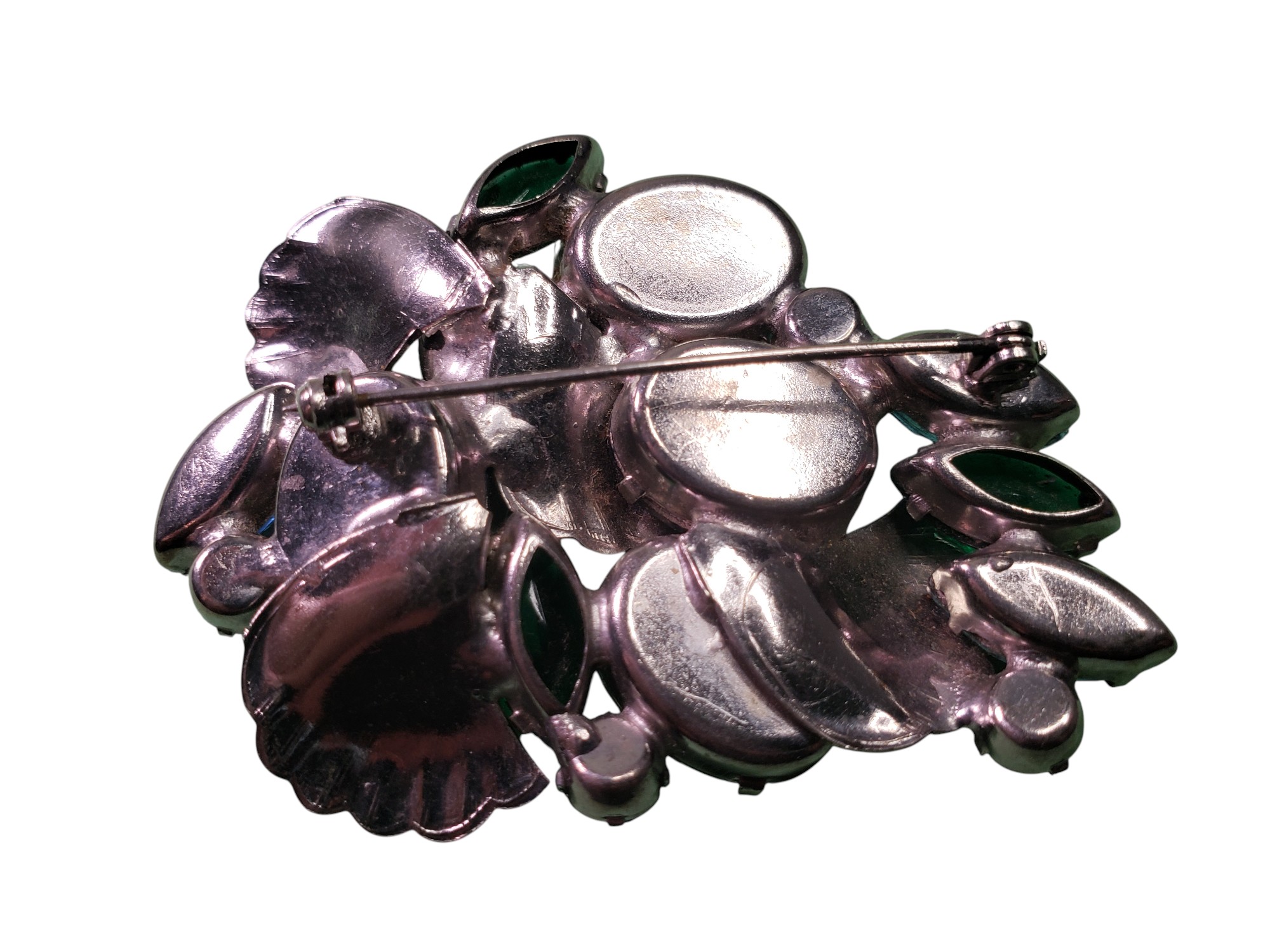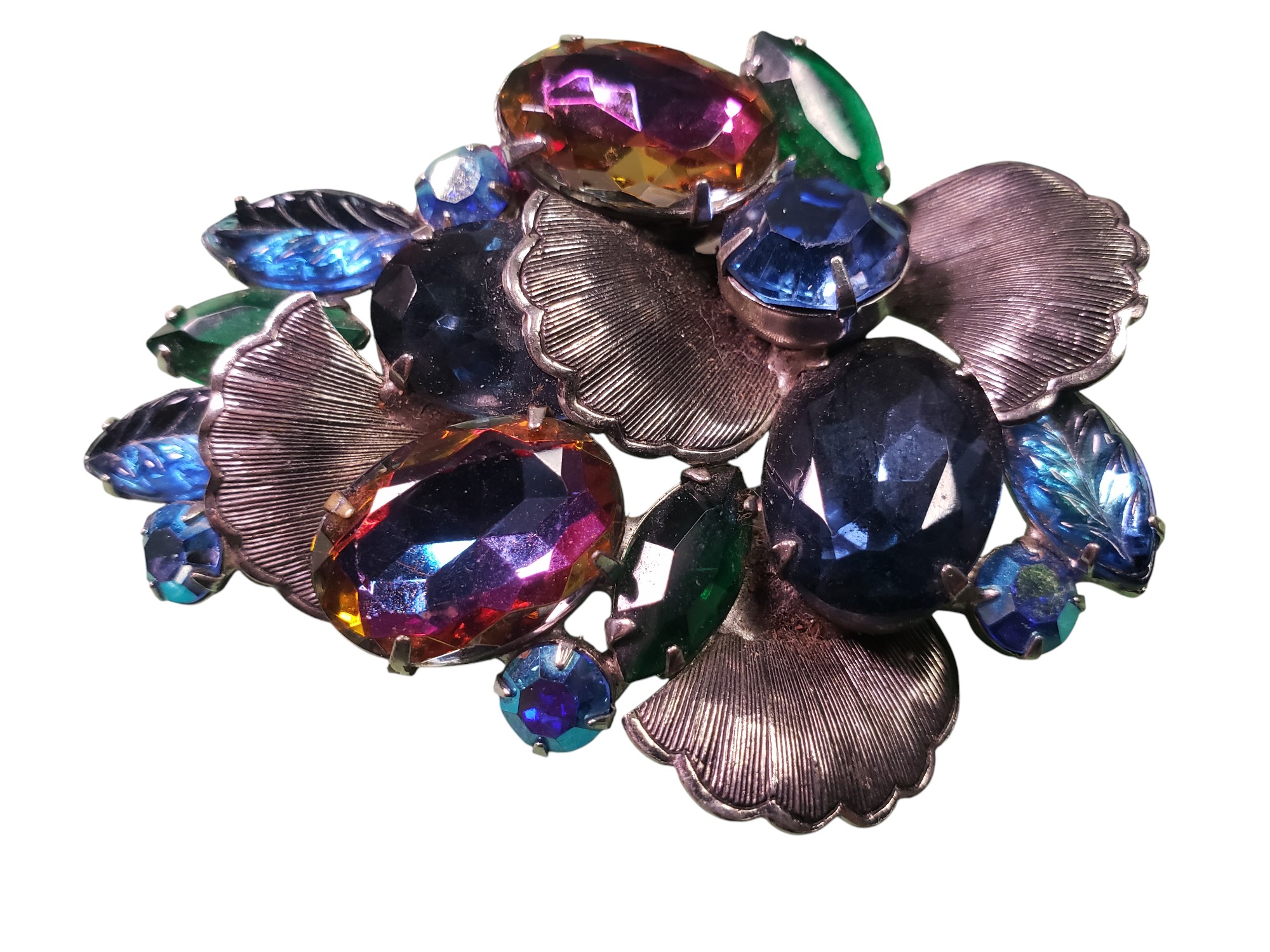 Gorgeous Juliana pin in silver tone setting. Large watermelon stones, blue, green and navy rhinestones, and carved blue leaves decorate the beautiful pin. Measures 2 5/8″ by 2″. Excellent condition.