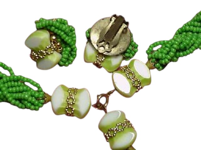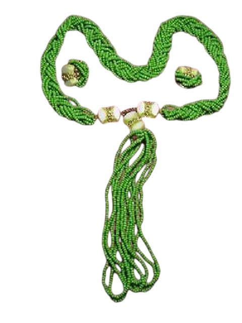 Beautiful Kelly green Seed bead braided necklace and clip-on earrings set. The necklace has a tassel which is detachable. Necklace measures 18″ long, and the tassel itself is 5.5″ long. Matching clip-on earrings are 7/8″ in diameter. Excellent condition.