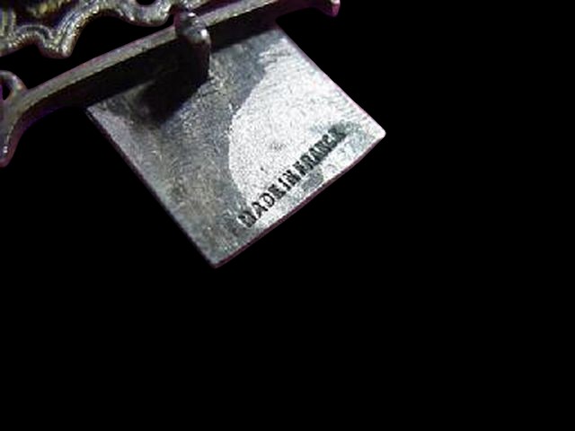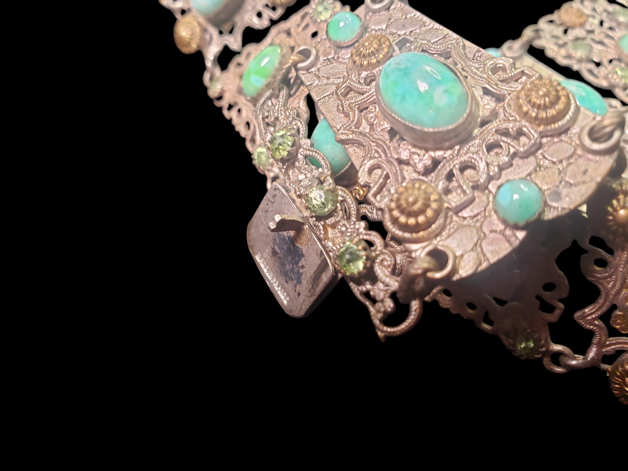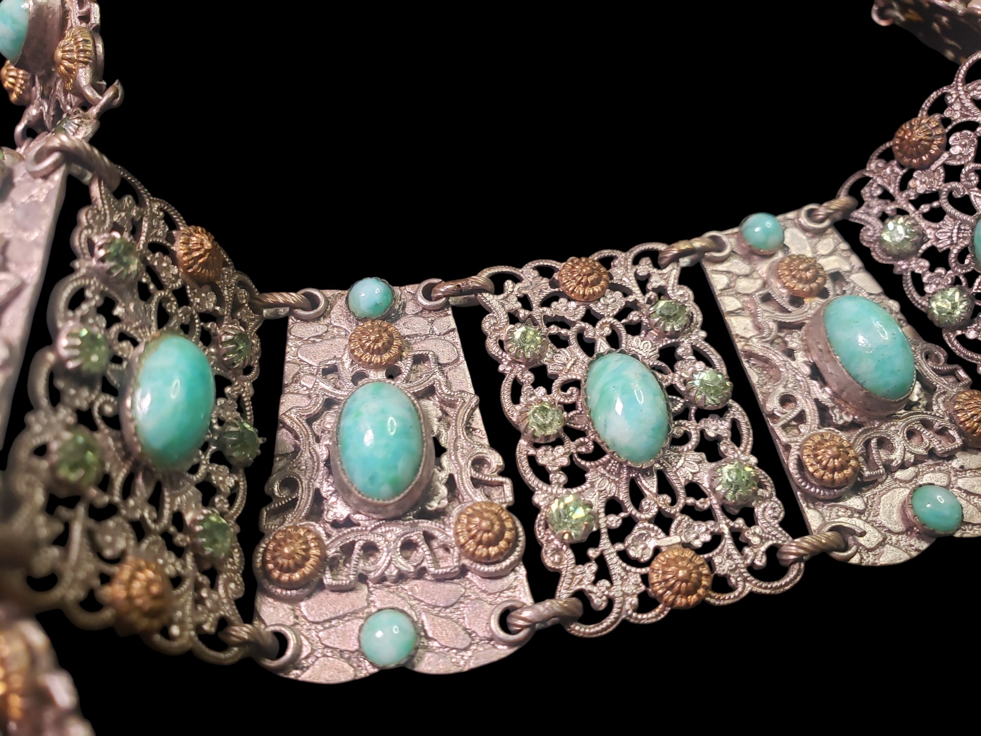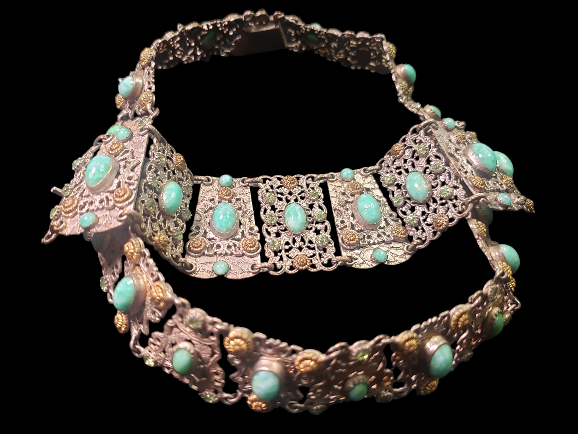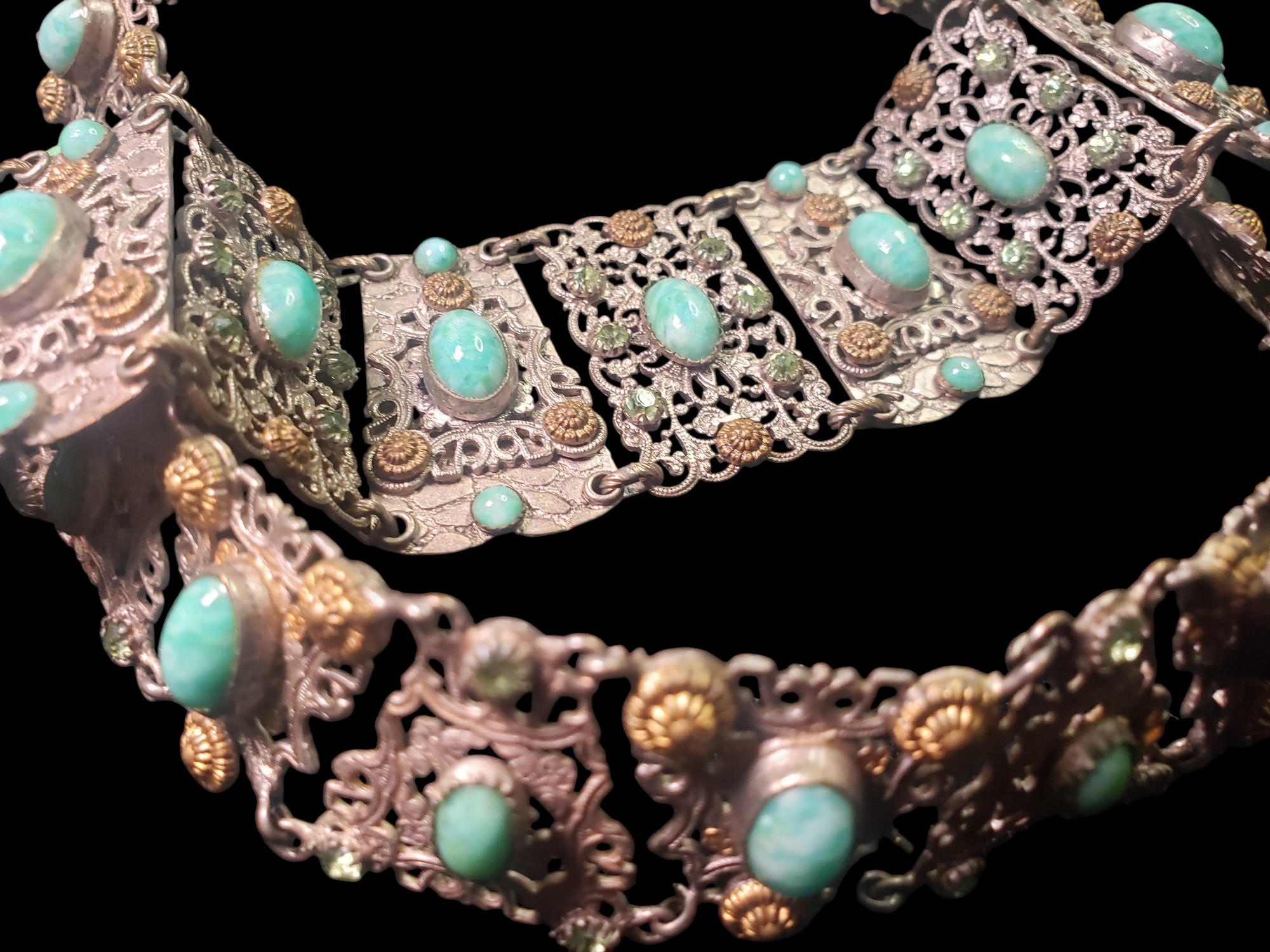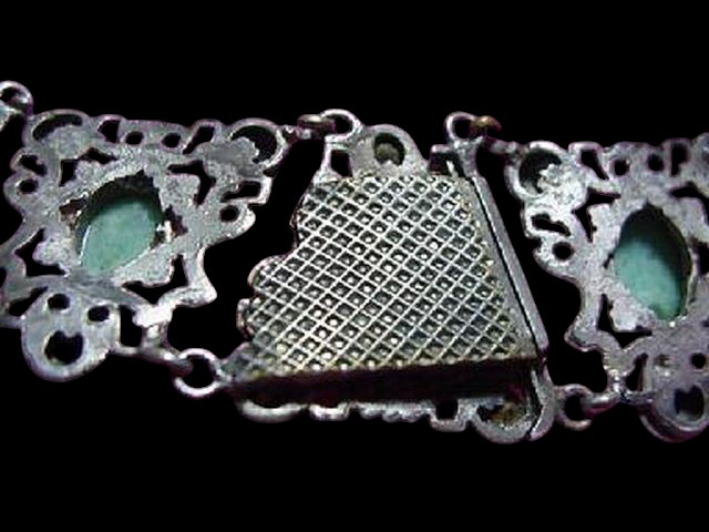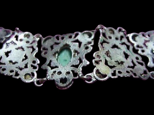 Unusual French necklace and bracelet set. The pictures really do not do it justice! You will not be disappointed. The necklace is a collar type and lays very close and tight on the neck. The setting made of sections and is silver over brass, very detailed and very intricate with beautiful filigree. Each section has a large marbled green cabochon bezel set and adorned in some cases by smaller cabochons in other by beautiful peridot rhinestones. There also gilded decorations. Very delicate and unique. Unusual push in clasp. Signed on both necklace and bracelet clasps “Made in France”. Necklace is about 15″ long and 1″ wide. Bracelet is 6.5″ long and 1.5″ wide. Excellent condition.