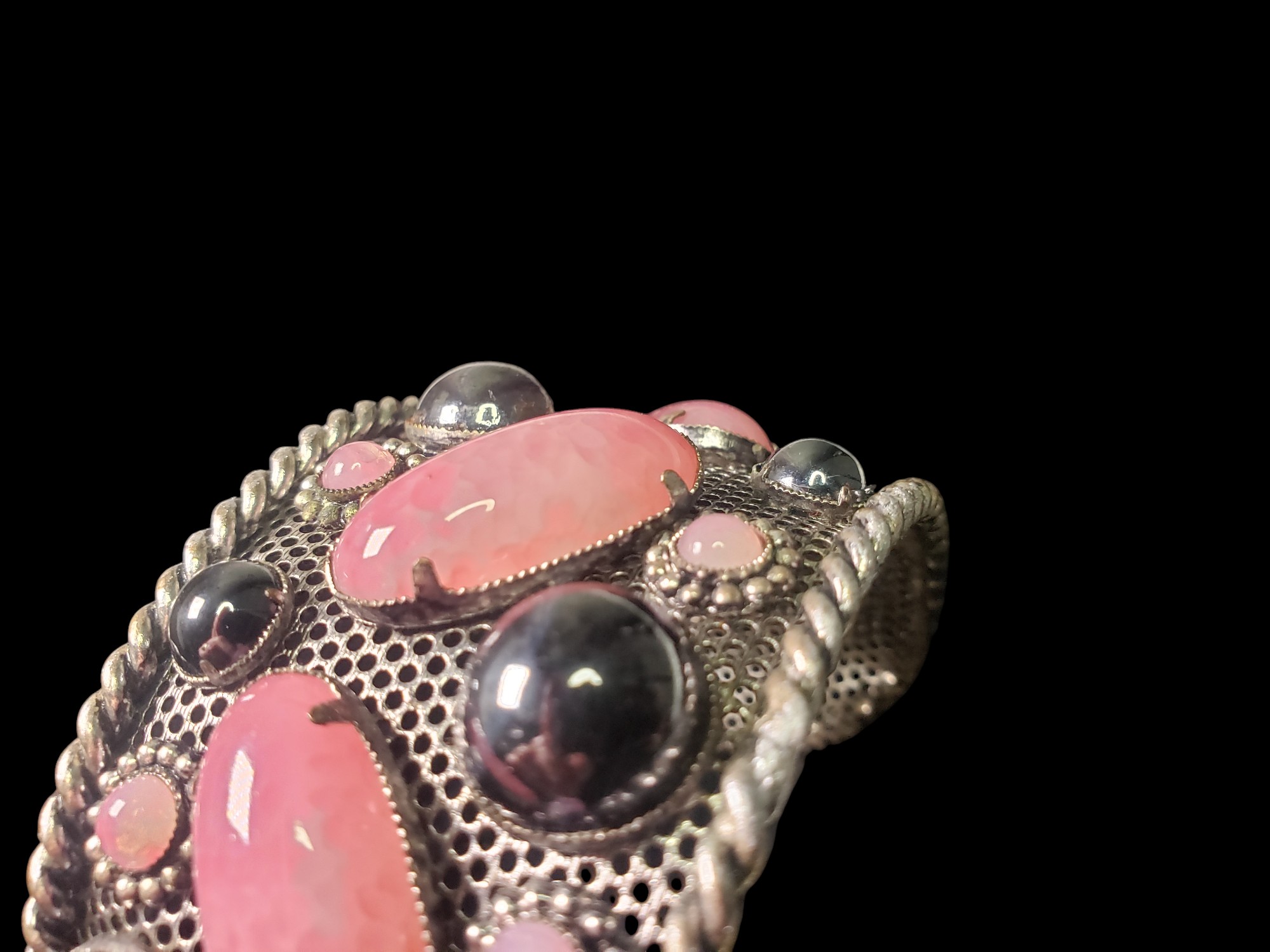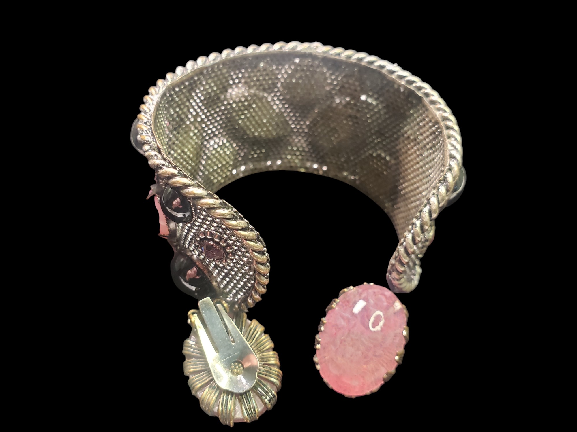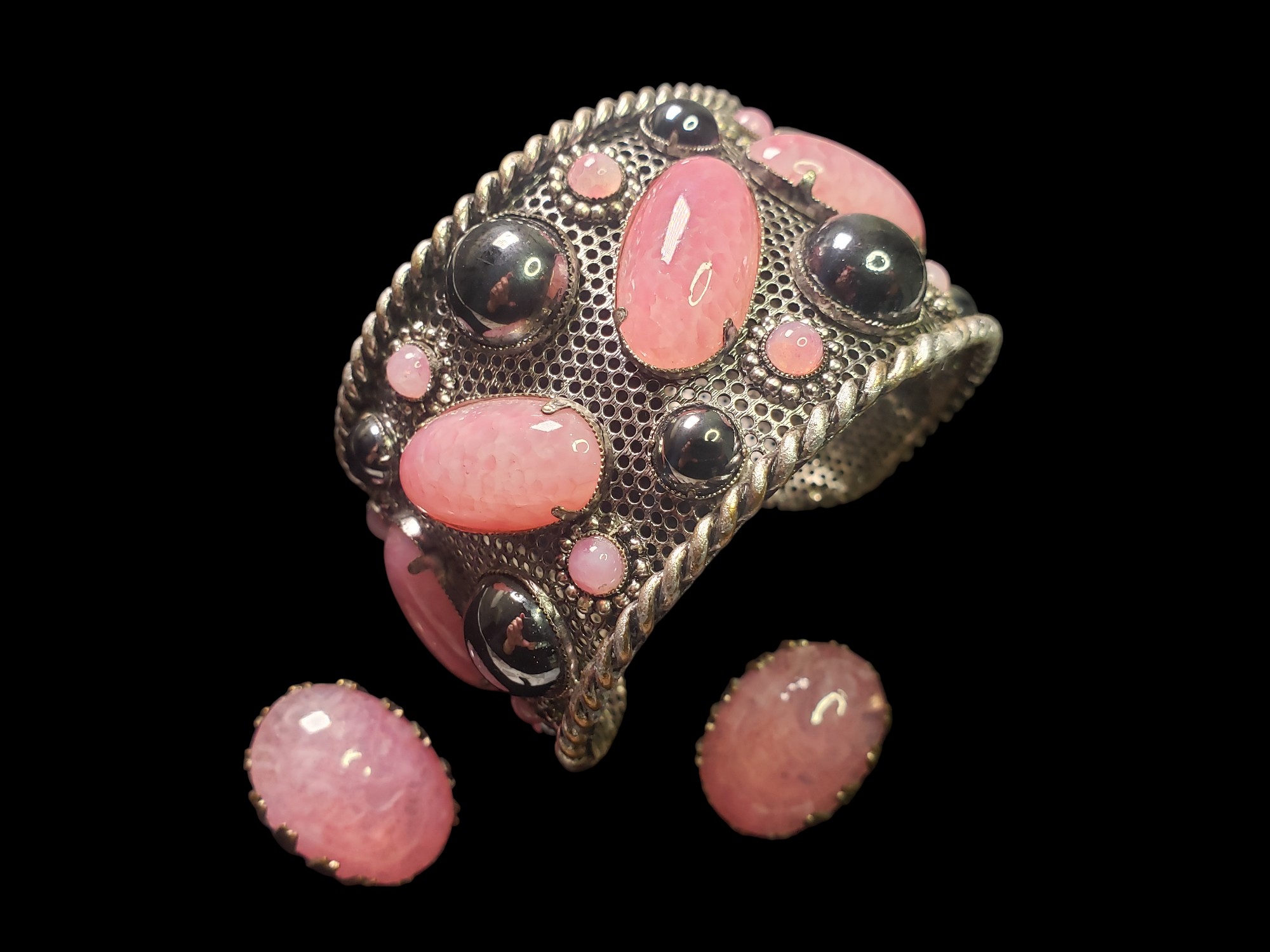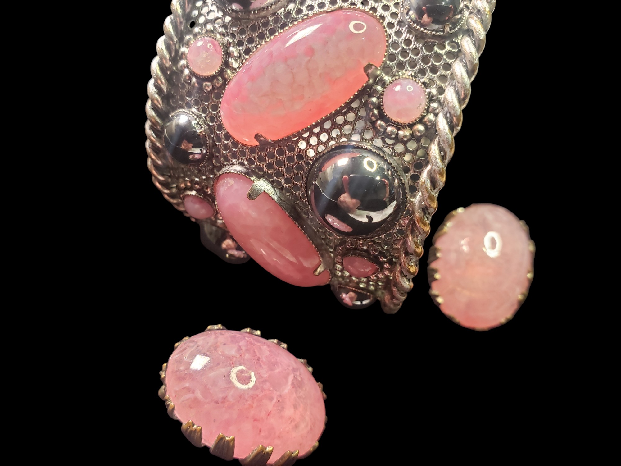 Amazing and unique glass pink quartz and hematite silver tone mesh cuff bracelet and clip on earrings set. Very chunky and STUNNING! Silver tone mesh setting embellished with various sizes of pink quartz and hematite cabochons and pink rhinestones – including huge (1″ by 1/2″) and the most gorgeous oval faux pink quartz cabochons. It very well might be Schreiner. I had a few of Schreiner brooches that used exactly the same oval cabochons. Bracelet measures about 1 3/4″ wide and would fit up to a 7 1/2″ wrist comfortably (it’s hard to bend it). Twisted rope is applied to the edge . Matching earrings feature even larger (1″ by 1 3/4″) oval pink quartz cabochons prong set in silver tone setting. Excellent condition.