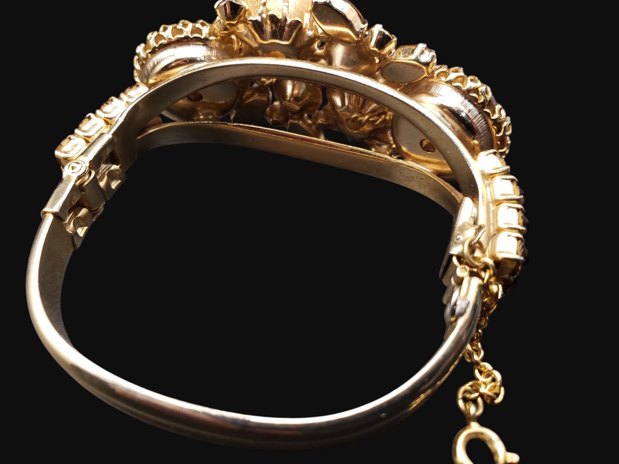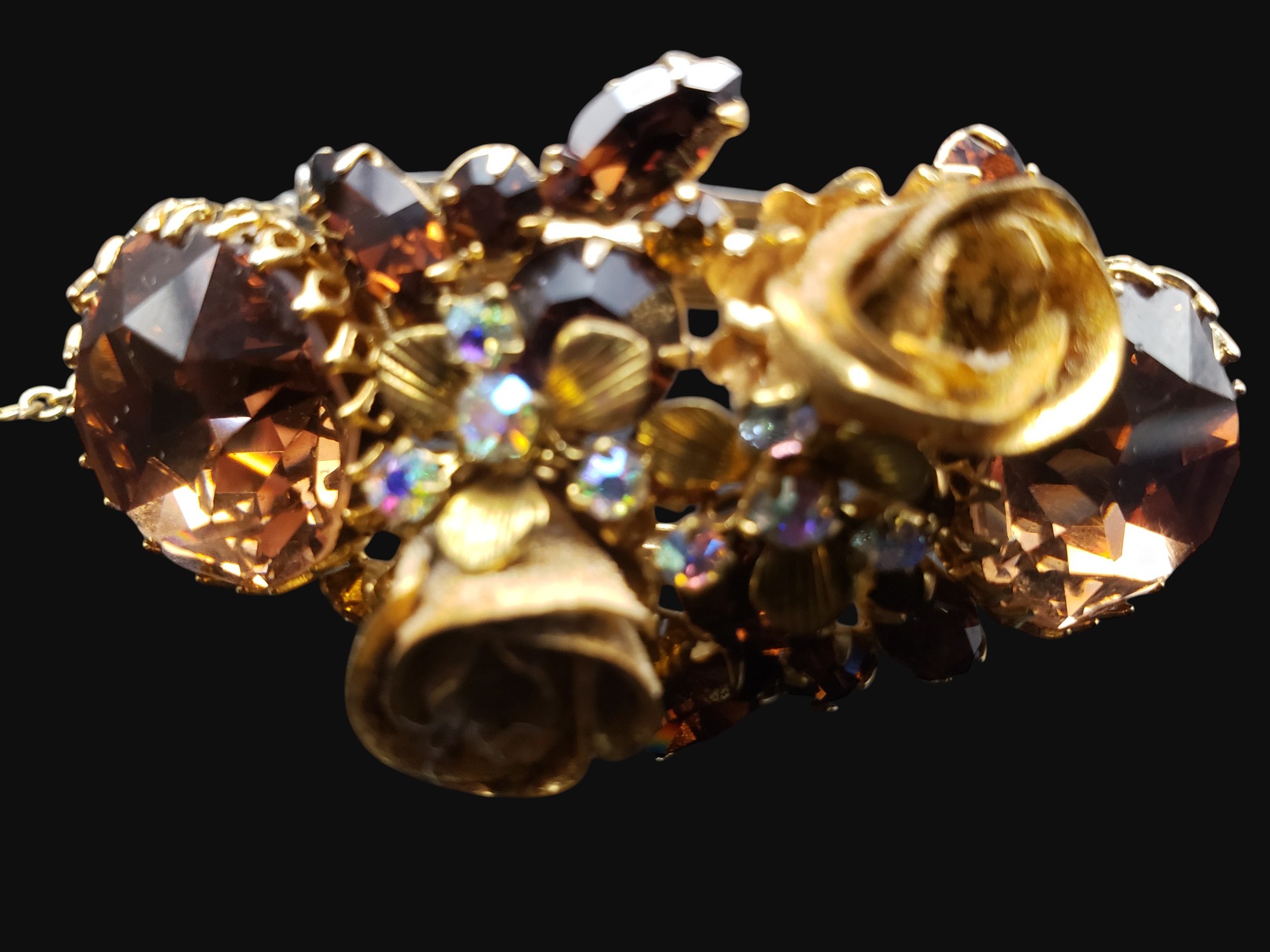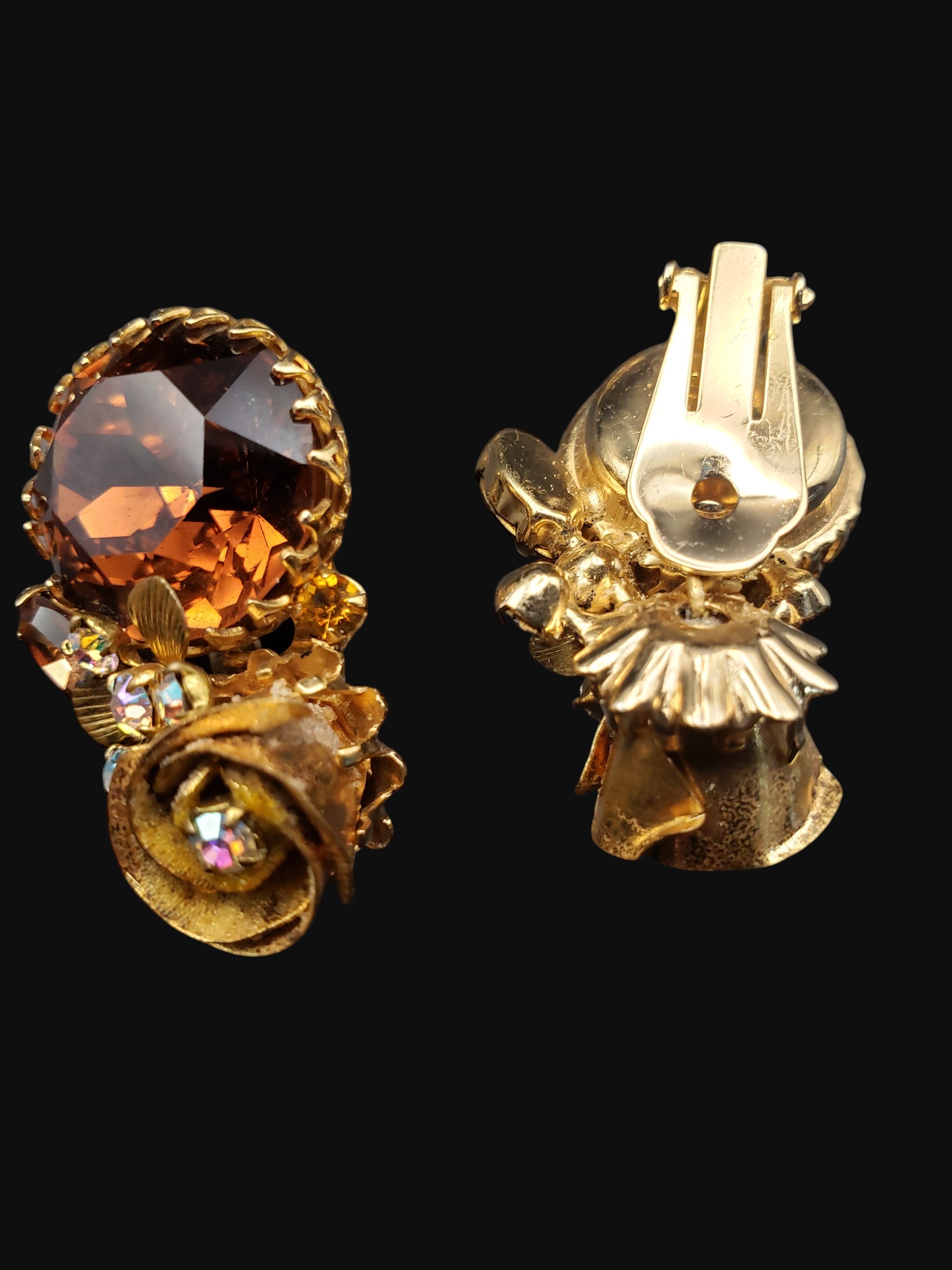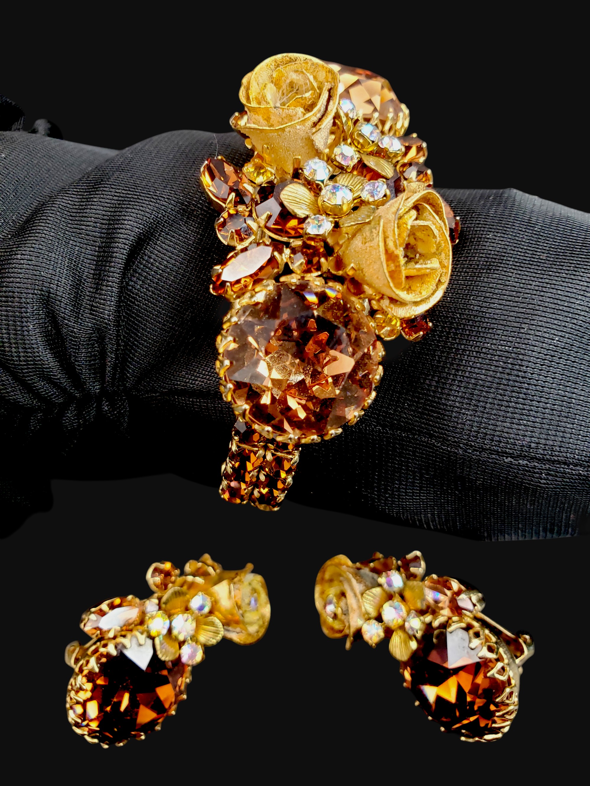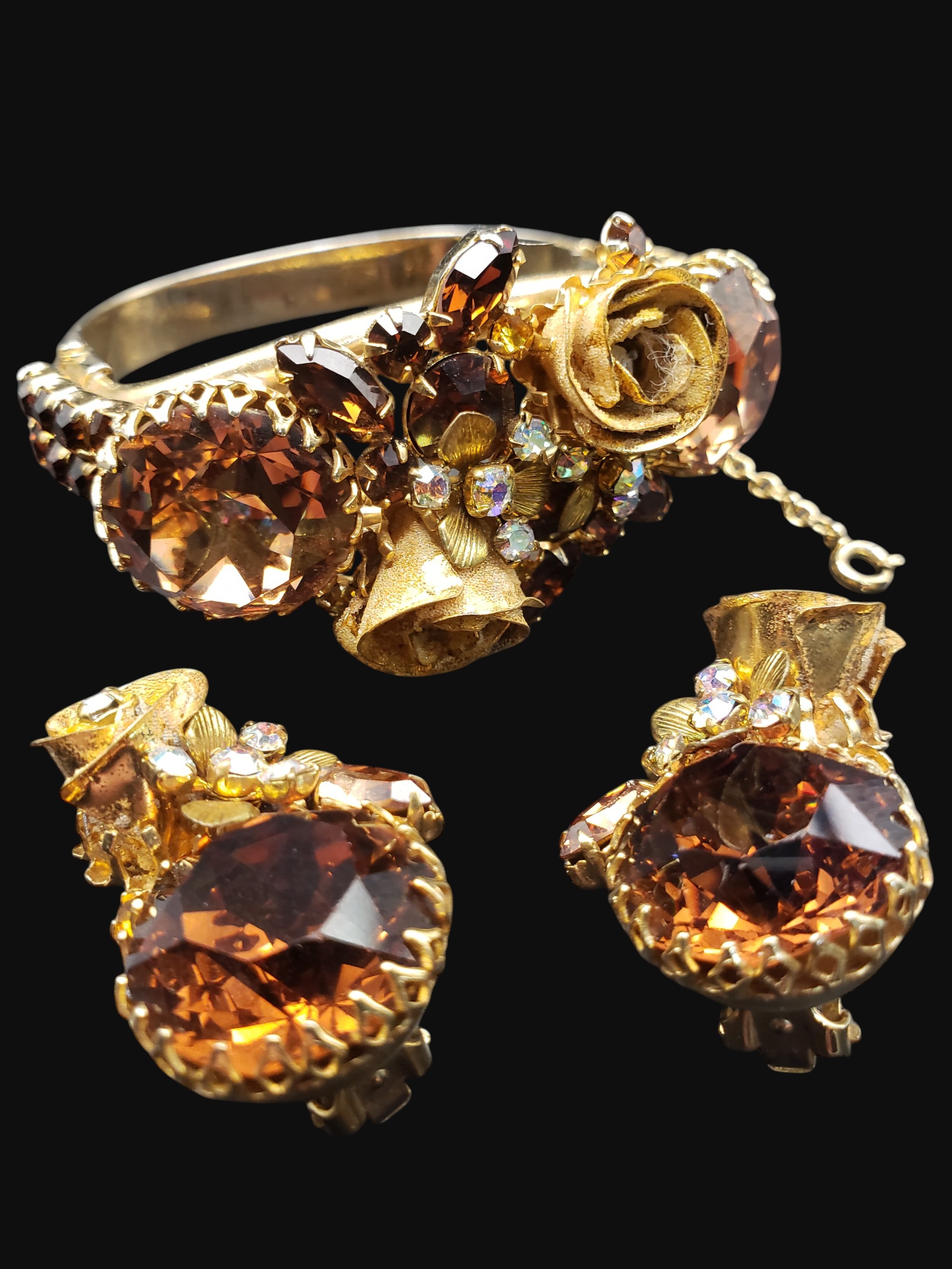 FANTASTIC Hattie Carnegie Bracelet and Earring Set. Very ornate golden setting with golden roses. Stones are fabulous topaz stones in different shapes and Aurora Borealis stones. The set is not signed but attributed to Hattie Carnegie. Bracelet is oval and measures 2″ by 1 7/8″ on the inside. Center is 1.25″ wide. Bracelet has a safety chain. Matching clip on earrings are 1 3/8″ by 7/8″. Excellent condition.